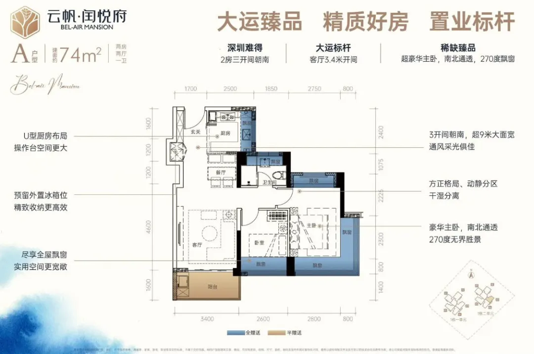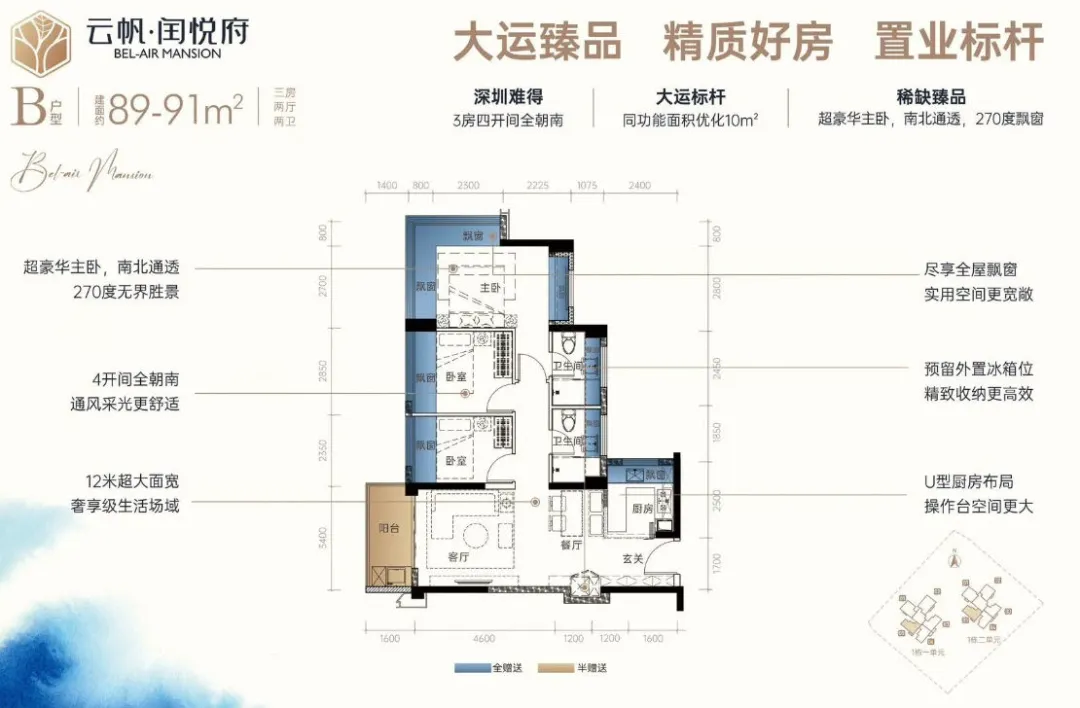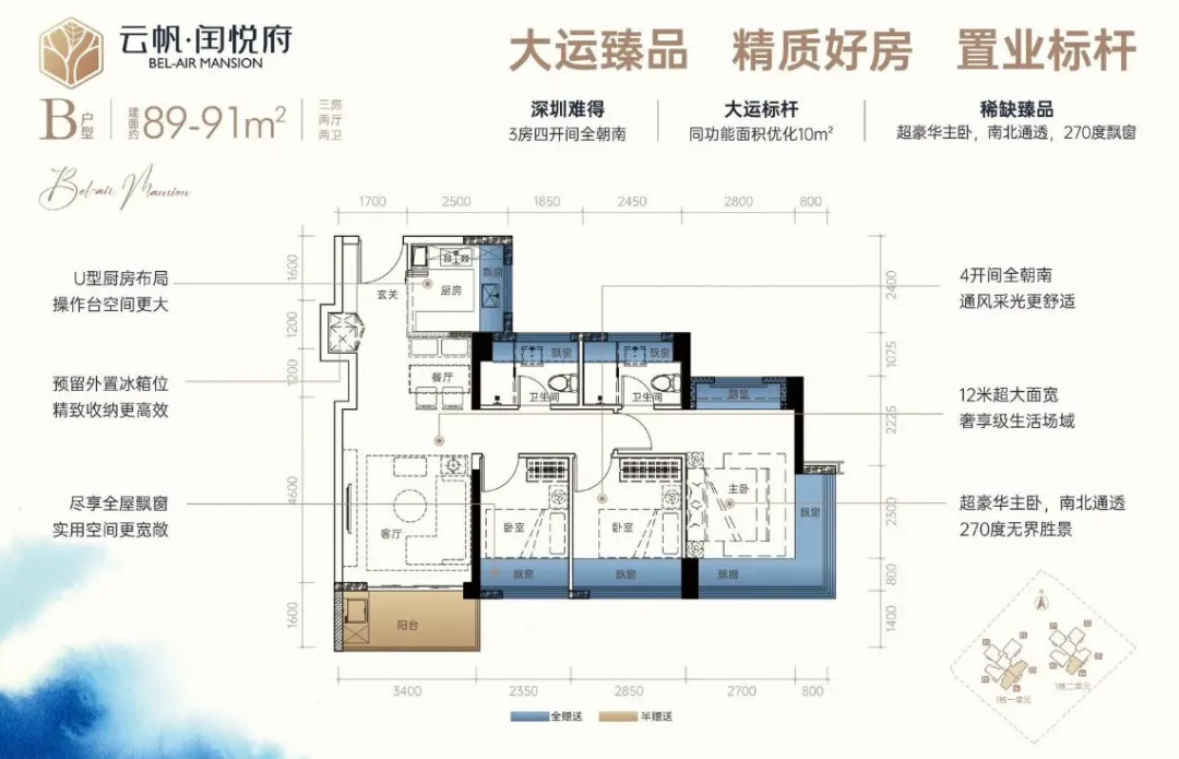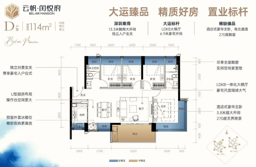龙岗中心城,润悦蓝湾公馆【备案名为云帆•闰悦府】首推1栋1/2单元共148套房源,建面约73-114㎡2-4房,容 积 率4.3,梯 户 比二梯五户,车 位 比约1:1.4,户型图已经全部发布。项目所有房源均为东南、西南或南北通透朝向,通风采光优势显著。闰悦蓝湾公馆,位于龙岗区龙城街道龙翔大道与如意路交汇处东南侧约140米,地处龙岗中心城板块。
