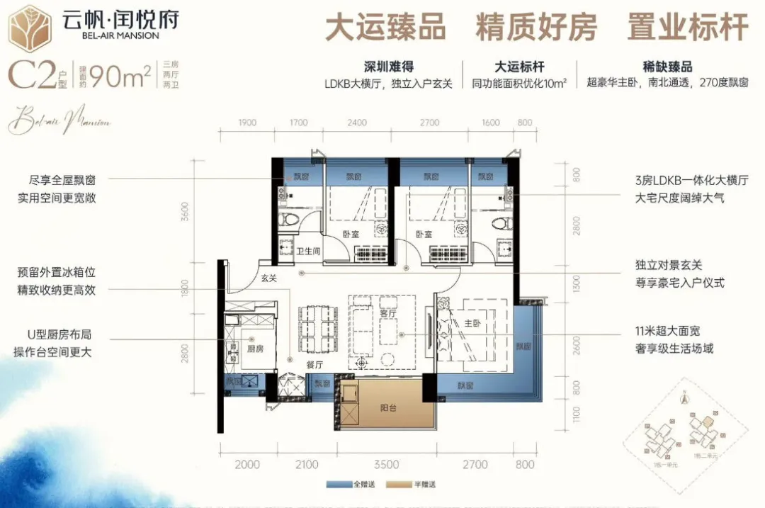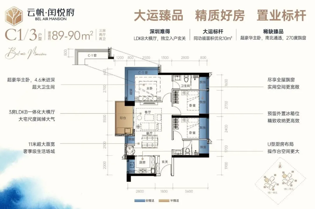 闰悦蓝湾公馆,由深圳市盛悦兴投资有限公司与深圳市爱联股份合作公司共同开发,总占地面积约7420.63㎡,总建筑面积约4.6万㎡,计容建筑面积约3.35万㎡,容积率4.3,绿化率40.01%,共由2栋27-29层高住宅组成,其中1栋1单元住宅29F,1栋2单元住宅27层。