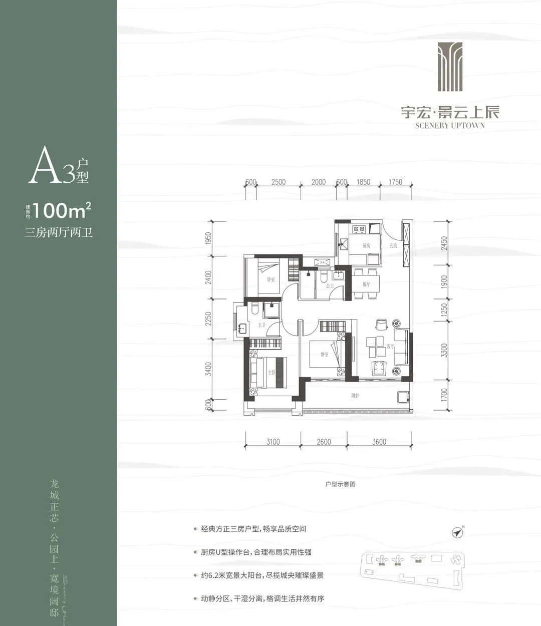 100㎡的3房2厅2卫,设计的是竖厅格局,客厅3.6米开间,LDKB一体化,三开间朝南,3个卧室分别做到了3.1米/2.6米/2.4米的宽度,客厅连接次卧出6.2米长的大阳台,U型厨房,卫生间干湿分离,得房率约76%(不含赠送),东南朝向。
