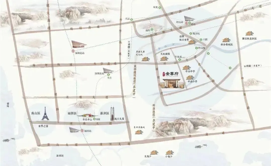 信达·金尊府构建了地铁、干道、高铁、公交四维立体交通网络,出行效率与便捷度拉满。轨道交通上,项目距地铁14号线锦龙站仅约500米,步行轻松可达,作为东部快线,14号线可9站直达福田CBD,快速串联龙岗、福田、南山等核心区域,跨区通勤、商务出行高效无忧;周边还覆盖16号线坪山围站,双地铁加持实现全城轨交换乘。城市干道方面,紧邻坪山大道、锦龙大道两大主干道,快速衔接坪盐通道、南坪快速三期、沈海高速、外环高速,自驾约10分钟达盐田、20分钟抵罗湖、30分钟畅达福田,无缝融入深圳主城生活圈。城际交通上,临近坪山高铁站,可快速通达深圳北站、福田站,直连香港西九龙,深大城际(建设中)建成后约40分钟速达宝安机场,畅行大湾区。公交配套同样完善,1公里内有同富路口站、坪山中山小学站等多个站点,812路、764路、935路等多条线路覆盖,满足日常短途出行、接驳地铁的多元需求,全方位解决业主出行痛点。
