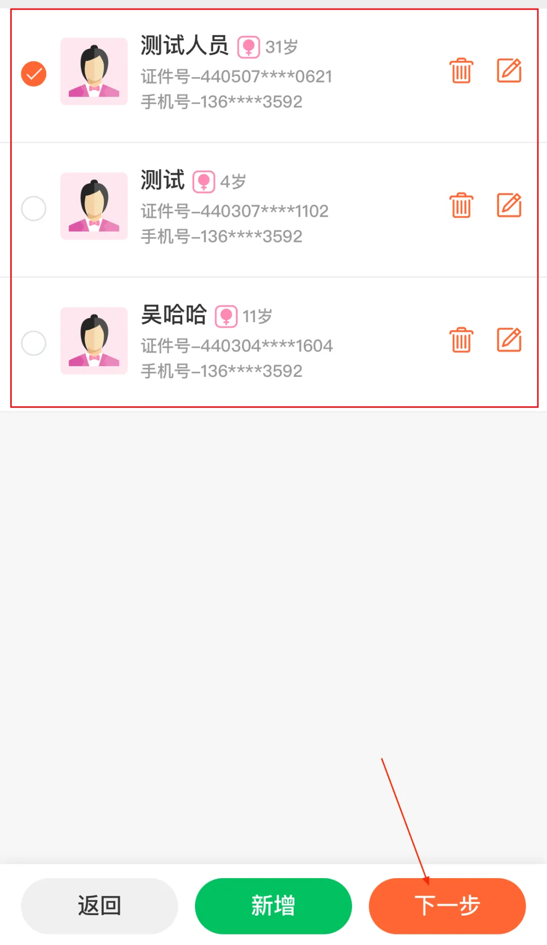 第三步:点击【下一步】,选择人员,点击【下一步】。如未添加过人员,可点击【新增】按钮完善人员个人信息再返回报名。报名成功的用户可点击【我的订单】查看订单详情。