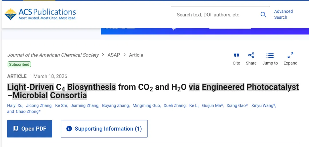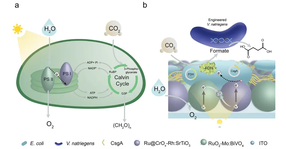 光驱动CO₂和H₂O合成C4化合物:基于工程化光催化剂-微生物联合体(Light-Driven C4 Biosynthesis from CO2 and H2O via Engineered Photocatalyst-Microbial Consortia)