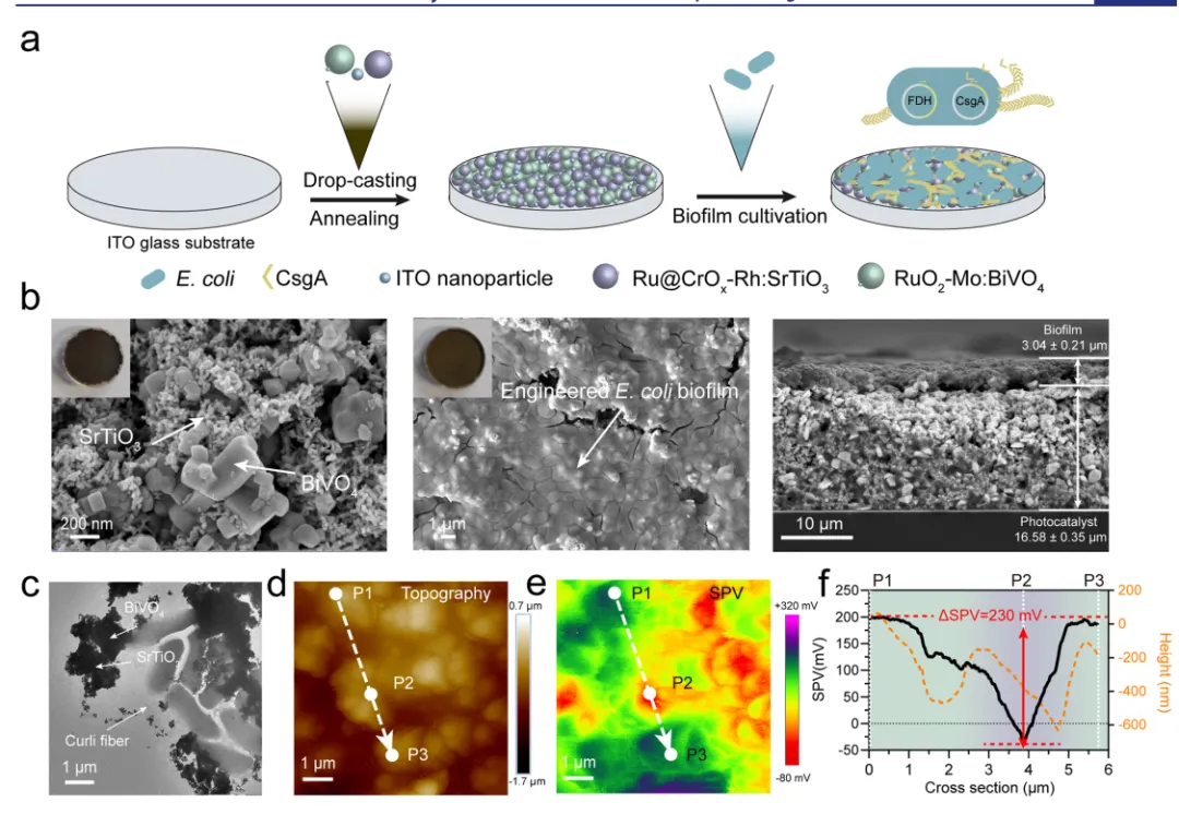 通过质粒系统改造大肠杆菌MG1655,使其表达CsgAHis(诱导生物膜形成)和甲酸脱氢酶(FDH)。TEM和刚果红染色确认生物膜形成,Western blot验证FDH表达。采用RuO₂-Mo:BiVO₄(模拟光系统II,氧化H₂O)和Ru@Cr₂O₃-Rh:SrTiO₃(模拟光系统I,还原CO₂)构建Z型光催化剂,ITO作为电子传递介质。将光催化剂滴铸于ITO玻璃,退火后于M63培养基中培养72小时,形成光催化剂-生物膜生物杂合片。SEM显示生物膜(3.04 μm)均匀共形包覆光催化剂(16.58 μm)。TEM和EDS证实光催化剂纳米颗粒锚定于生物膜基质。光辅助KPFM显示两种光催化剂间表面光电压差达230 mV,证明有效的电荷分离。