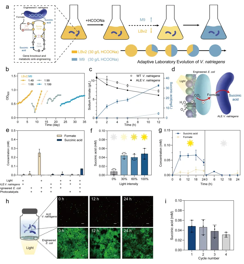 相比之下,自然微生物联合体通过劳动分工实现高效的碳升级——这一策略启发了合成生物学中分布式生物合成的方法。尽管该范式在生物杂合系统中仍未被充分探索,但有望突破人工光合成的C₂上限。本研究报道了一种光催化剂-微生物联合体生物杂合系统,整合Z型光催化剂与工程化大肠杆菌生物膜和需钠弧菌,实现了以H₂O为唯一电子供体的光驱动CO₂固定合成丁二酸。