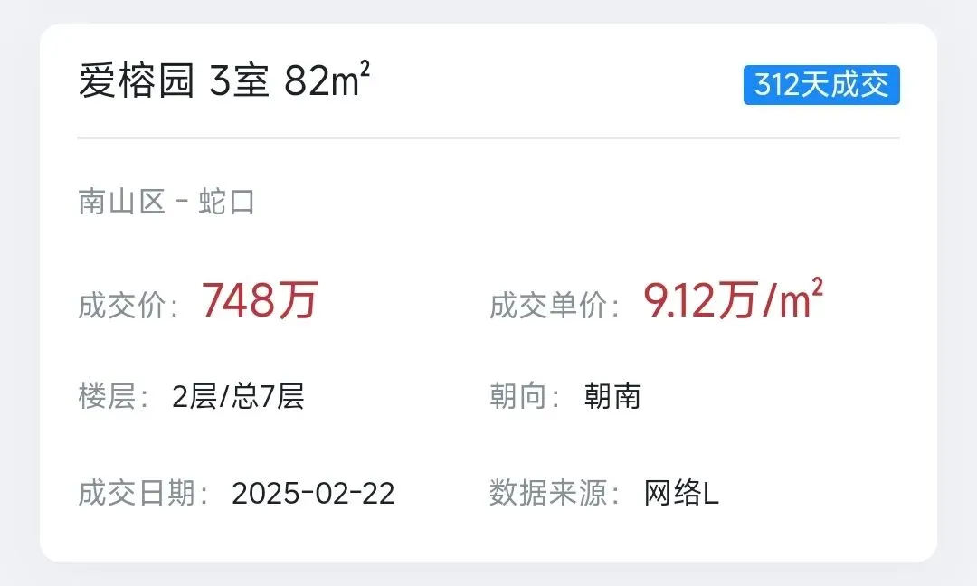 老蛇口的爱榕园片区项目,2024年第四季度被列入城市更新计划,房价短期内从7万多涨到8-9万;但2025年5月,市场传来住宅限高80米的消息,爱榕园的成交热度就开始明显下滑,今年成交价又回到了7万多。