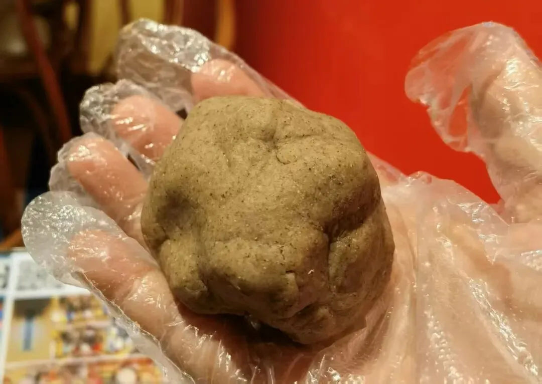 和好的青稞面手感很柔软,就像橡皮泥一样,可以随意捏出各种形状。我先捏了一个圆球,想想不大好下嘴咬,又把面团搓成了细长条。
