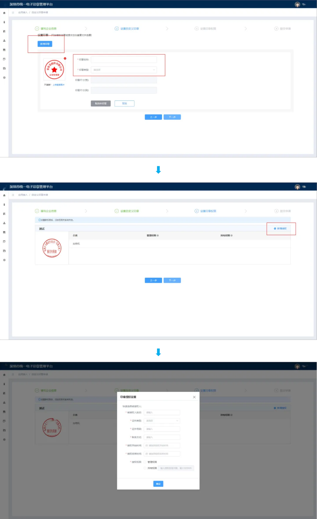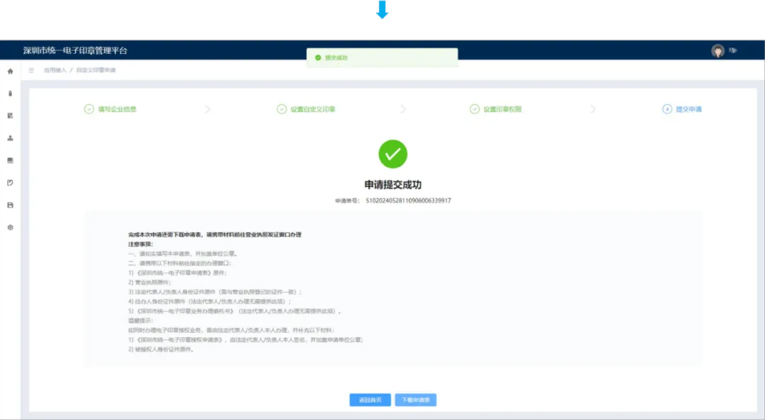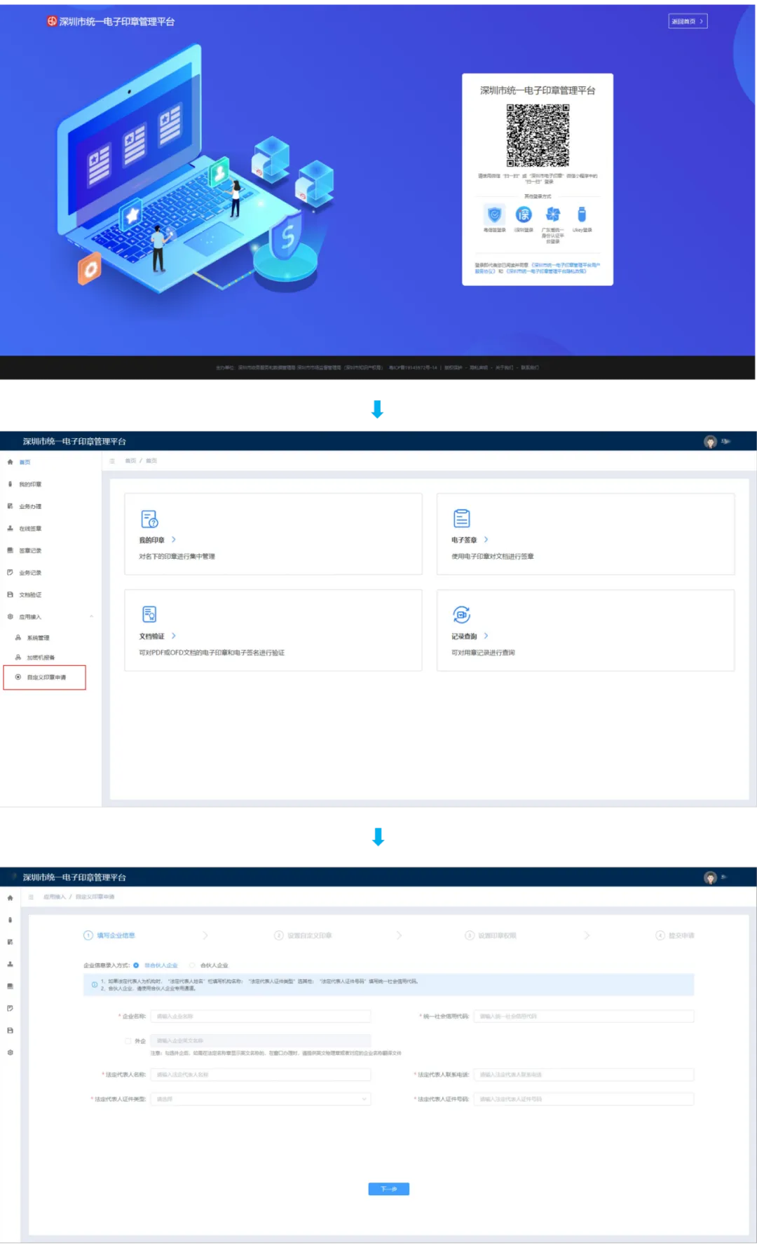 打开深圳市统一电子印章管理平台官方网站,扫码登录后,点击左侧菜单栏【自定义印章申请】,首先填写企业信息,接着选择现有印章模板或上传对应实物印章的盖章图片。如需同时进行印章授权设置,请填写被授权人的详细信息和授权权限,确认授权信息后申请提交成功,请下载申请表并携带相关材料前往办事窗口。