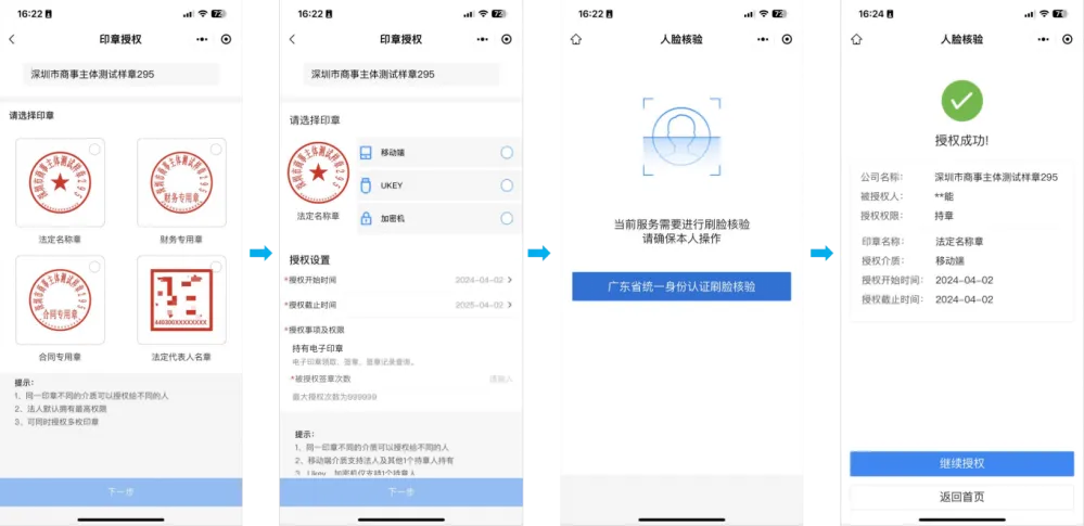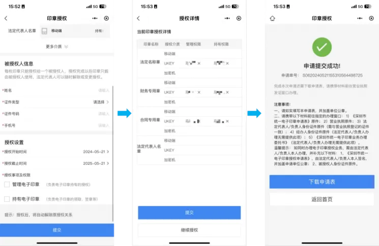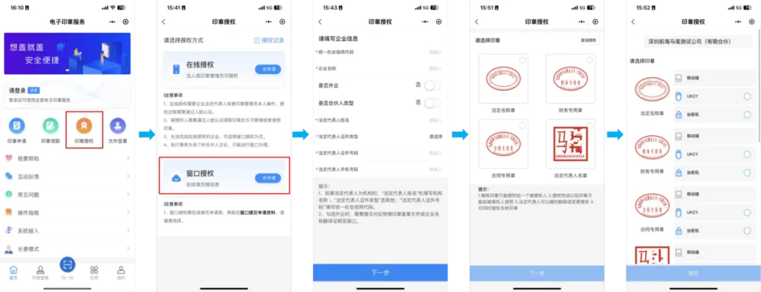 打开微信并搜索“深圳市电子印章 ”小程序,点击进入。在首页选择【印章授权】,随后选择【窗口授权】。按照系统提示,准确填写企业信息,选择需要授权的印章和领取介质,并填写正确的被授权人信息。完成授权设置后,核对授权信息并提交申请,申请成功后,请下载申请表由法定代表人/负责人签字并加盖单位公章后,携带相关材料前往办事窗口办理。