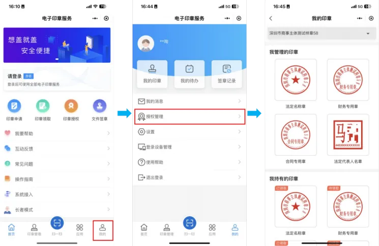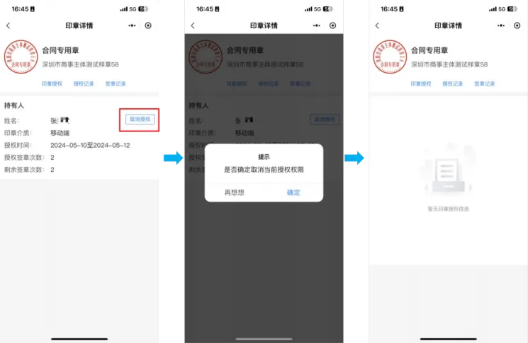 打开微信并搜索“深圳市电子印章 ”小程序,点击进入。选择下方菜单导航栏的【我的】,选择【授权管理】,在“我管理的印章 ”列表下选择需要取消授权的印章,点击【取消授权】,确认取消后,该被授权人的电子印章管理权和持有权限将被立即撤销。