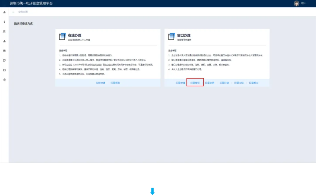 打开深圳市统一电子印章管理平台官方网站,扫码登录后,点击左侧【业务办理】,在“窗口办理 ”列表下选择【印章授权】。选择企业信息录入方式,正确填写企业信息后,选择授权类型为【取消授权】,并选定需要取消授权的印章。申请成功后,下载申请表由法定代表人/负责人签字并加盖单位公章后,携带相关材料前往办事窗口办理。