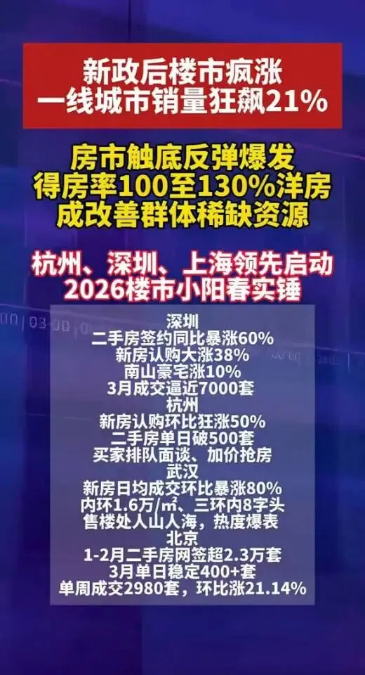 截至2026年3月23日,深圳楼市成交套数达8027套,延续“小阳春”强势态势。其中,二手房签约量创17个月以来周度新高,春节后实现周度“四连升”,较去年同期增长18%;3月1 - 23日二手房住宅网签3545套,新房住宅网签1866套,市场活跃度显著提升。