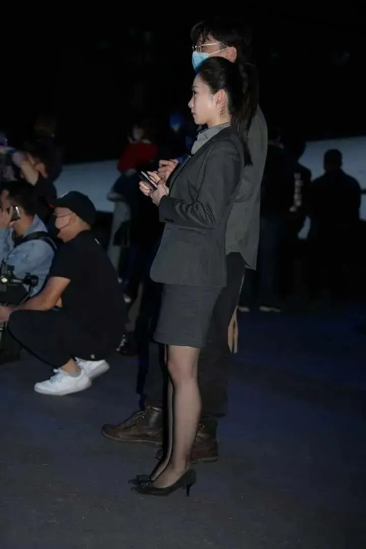 和一位年轻人说话的时候,她低头看手机,眉头微皱地笑了出来。深灰西装套裙与对方的休闲打扮存在对比之感,更突出了她干练精巧。就是在轻松的交谈中她也有一种很职业的气场,并且更加自然。