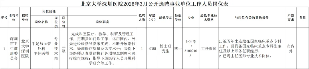 5.适应岗位要求的身体条件。6.招聘公告要求的其他条件。(二)有关要求。1.关于招考范围。户籍要求为“市内外”的岗位,符合条件的中国公民均可报考。2.关于报考专业。(1)应聘人员所学专业须与《岗位表》要求一致,专业是否相符可参考《广东省2026年考试录用公务员专业参考目录》(附件2),国外学历学位证未明确标注专业的,以学历学位认证书为准,学历学位认证书未标注的,提供相关证明材料(毕业论文、成绩单等)。应聘人员所学专业未列入专业目录(没有专业代码)的,可选择专业目录中的相近专业报考,所学专业必修课程须与报考职位要求专业的主要课程基本一致,并在业务考核前资格复核时提供毕业证书、所学专业课程成绩单、课程对比情况说明及毕业院校设置专业的依据等材料。如招聘岗位专业条件为“XX专业”(代码为6位数),应聘人员所获毕业证书上的专业名称为该“专业”的上一级“学科”(代码为4位数)或“学科门类”(代码为2位数),可按前述规定以相近专业报考。(2)所学专业须与《岗位表》规定的学位层次相对应。(三)有下列情况之一的,不接受报名。1.受过刑事处罚的;2.被开除中国共产党党籍的;3.被开除公职的;4.被依法列为失信联合惩戒对象的;5.法律法规规定的其他情形。二、报名(一)报名方式。应聘人员可选择网上报名或现场报名方式。网上报名:应聘人员将岗位要求所需的全部资料原件扫描为PDF格式(按资料名称命名,如“身份证、博士毕业证”),文件压缩打包后发送至邮箱bjdxszyy@wjw.sz.gov.cn(邮件主题为姓名+应聘岗位)。现场报名:应聘人员将岗位要求所需的全部资料原件提交到北京大学深圳医院人力资源部307室进行现场资格审核,并留下原件扫描件。(二)报名时间。2026年3月30日至2026年4月3日。(三)提交报名所需资料(扫描件)。1.《深圳市事业单位公开选聘工作人员报名表》(附件3)。2.身份证或户籍本。3.高中(中专)毕业后各阶段学历、学位证书以及最高学历、学位验证报告,属境外学历的,提供教育部留学服务中心出具的学历学位认证书。4.专业技术资格证书、医师执业证、医师资格证。5.证明应聘人员符合岗位规定条件的其他材料。6.个人专业技术能力介绍资料、论文、科研成果、荣誉(奖状)证书等证明材料可自愿提供。7.工作证明:如聘用(劳动)合同、社保缴纳凭证(含养老保险)等。(四)报名注意事项。1.应聘人员应符合选聘公告有关条件及要求方可报名。2.应聘人员应对提交材料的真实性负责,我院在选聘过程中,如发现应聘人员有弄虚作假等行为的,将取消报考、选聘或聘用资格。3.应聘人员提供的联系电话应准确无误,确保能够及时联系。因提供错误联系信息造成的后果由报考人员本人承担。三、资格审核根据选聘对象条件和岗位要求对应聘人员进行资格审核。资格审核通过的,我院将通过短信、电话或邮件方式告知应聘人员,并确定为考核人选。资格审核不通过的,我院将通过邮件形式给予书面告知,不予进入考核环节。资格审查贯穿招聘全过程,一旦查实应聘人员资格不符,随即取消应聘人员资格。四、考核(一)考核方式和内容。本次公开选聘采取直接业务考核的方式进行。内容为选聘岗位相关的专业技能及综合素质测试。考核成绩满分为100分,合格线为60分。根据考核结果,按考核成绩从高到低排序,按照岗位招聘人数1:1的比例等额确定进入体检人员名单。(二)时间和地点。考核时间及地点等具体安排将在医院官网公示并另行电话通知。报名者未按规定时间参加业务考核的,视为自动放弃。考核结果及进入体检人员名单,由医院在考核结束后5个工作日内电话通知。五、体检根据考核结果等额确定体检人员。进入体检人员携带本人身份证及近期一寸正面免冠彩色相片1张,按时参加体检。不按时参加体检者,视为自动放弃。体检时间、体检结果等均由我院另行电话通知。体检标准参照《广东省事业单位公开招聘人员体检实施细则(试行)》执行。六、考察体检合格的人员,确认为考察人选,由我院在体检结束后30日内完成考察。考察内容包括政治素质、道德品行、能力素质、心理素质、学习和工作表现、遵纪守法及廉洁自律情况、岗位匹配度、是否存在需要回避的情形等情况。考察合格的,确定为拟聘人员;考察不合格的,取消拟聘用资格。七、公示拟聘人员名单在北京大学深圳医院、深圳市卫生健康委及深圳市人力资源和社会保障局官网公示,公示时间为5个工作日。八、聘用(一)拟聘人员经公示,没有投诉、经查投诉不实或投诉属实但不影响聘用,且不违反关于聘用、回避等有关规定的,由我院在规定时间内向深圳市人力资源和社会保障局申报办理聘用备案手续。所聘人员按我市岗位管理制度及相关政策实施管理,享受规定的薪酬待遇。(二)拟聘人员应在规定时间内到我院报到。无正当理由未在规定时间内报到或有正当理由经我院批准同意延期,但未在延期时间内报到的,均视为放弃聘用资格。九、有关事项说明(一)在招考过程中违反事业单位公开招聘人员办法及本公告规定的,按有关规定处理。(二)公告及其附件的所指日期、数字或等级均包含本数,计算截止时间为2026年3月30日。(三)因应聘人员体检不合格、考察人选未被确定为拟聘用人员、拟聘用人员公示结果导致不能聘用、拟聘用人员放弃聘用等情形导