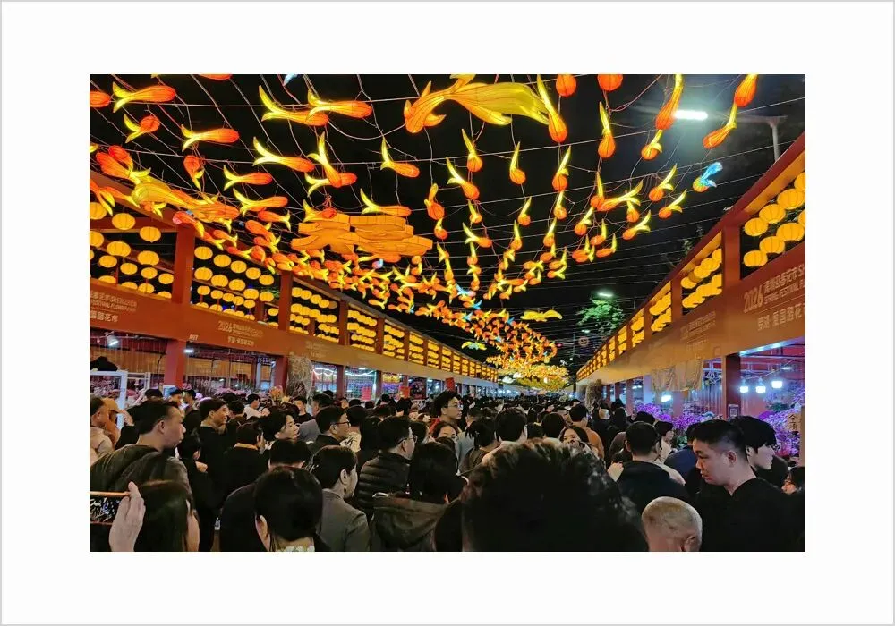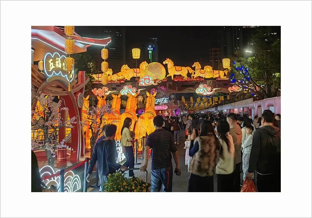 我们住在深圳的爱国路边,开车回家时,顺便逛了一下爱国路上深圳最大的春节花市。今年老历年是马年,花市上各色各样设计精巧的骏马遍布在灯光璀璨的夜空里,各种花果更是美仑美奂、目不暇接。“千盏鱼灯汇成星河”,“八骏全息幻境”闪闪烁烁,不断上演着视觉奇观。一路上人流如织,年味以一种新的方式在这里飘荡。我很喜欢这里的蝴蝶兰和黄金果,蝴蝶兰鲜艳,质感强烈,黄金果纯粹而饱满,极富有视觉冲击力。我们买了一点,带回家放着,增添节日的喜庆。