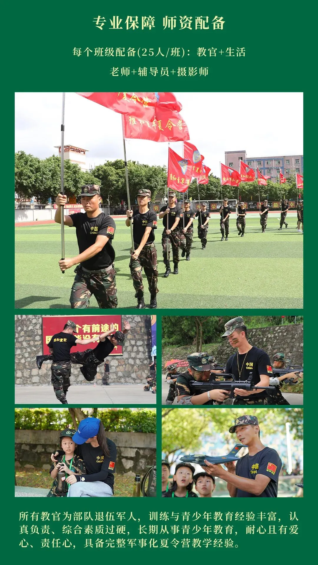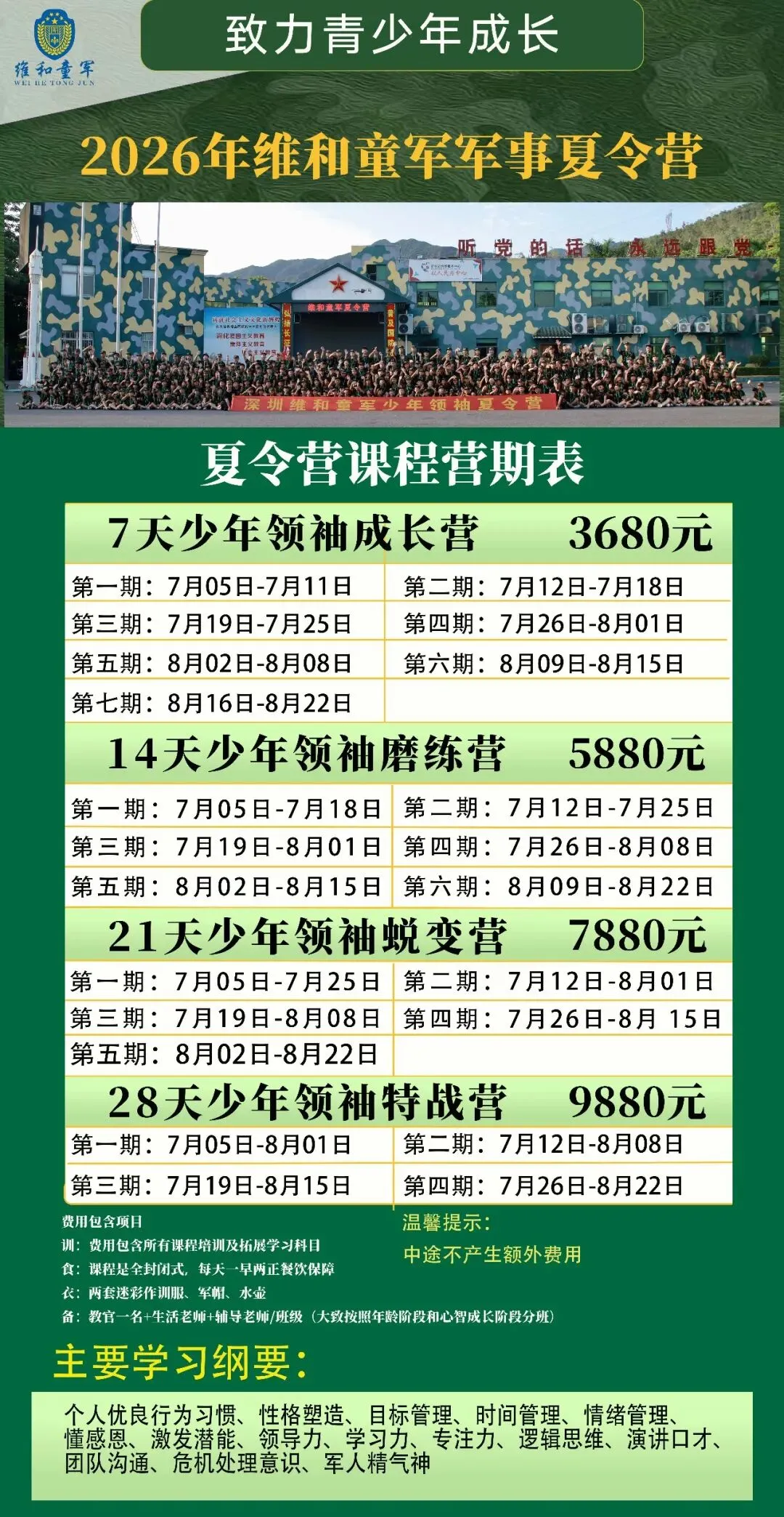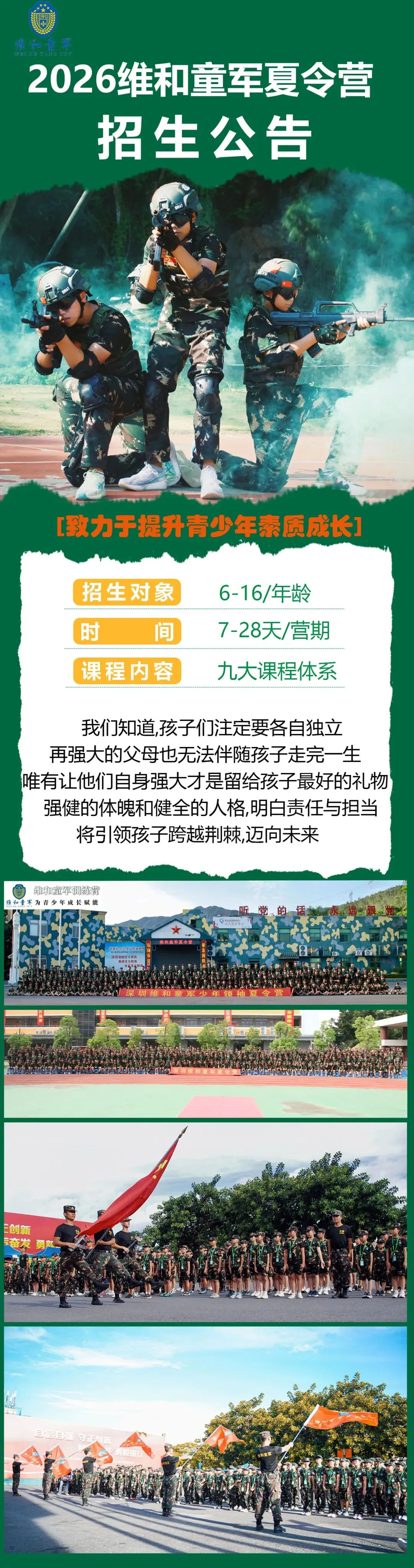 | 队列训练 立正、 稍息、 跨立、 四面转法队列训练、 纪律意识塑造、 习惯养成锻造 | | |