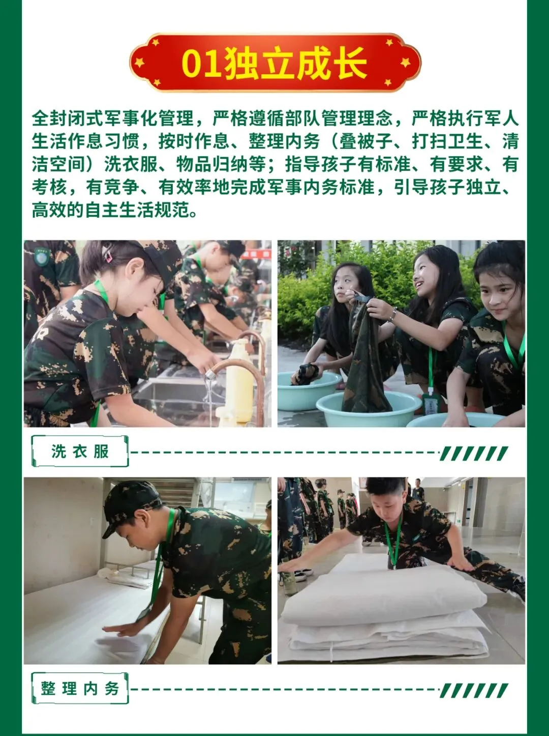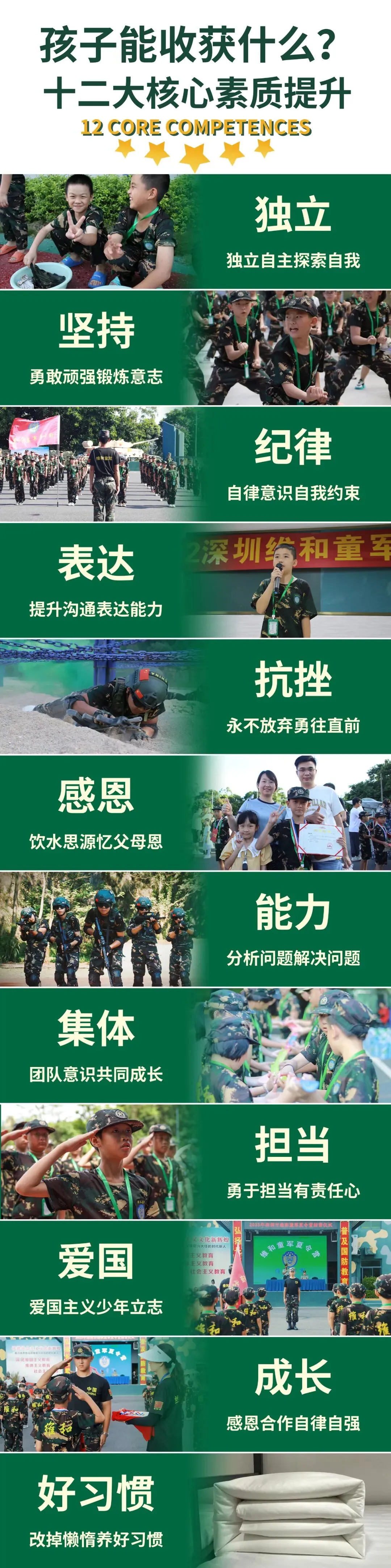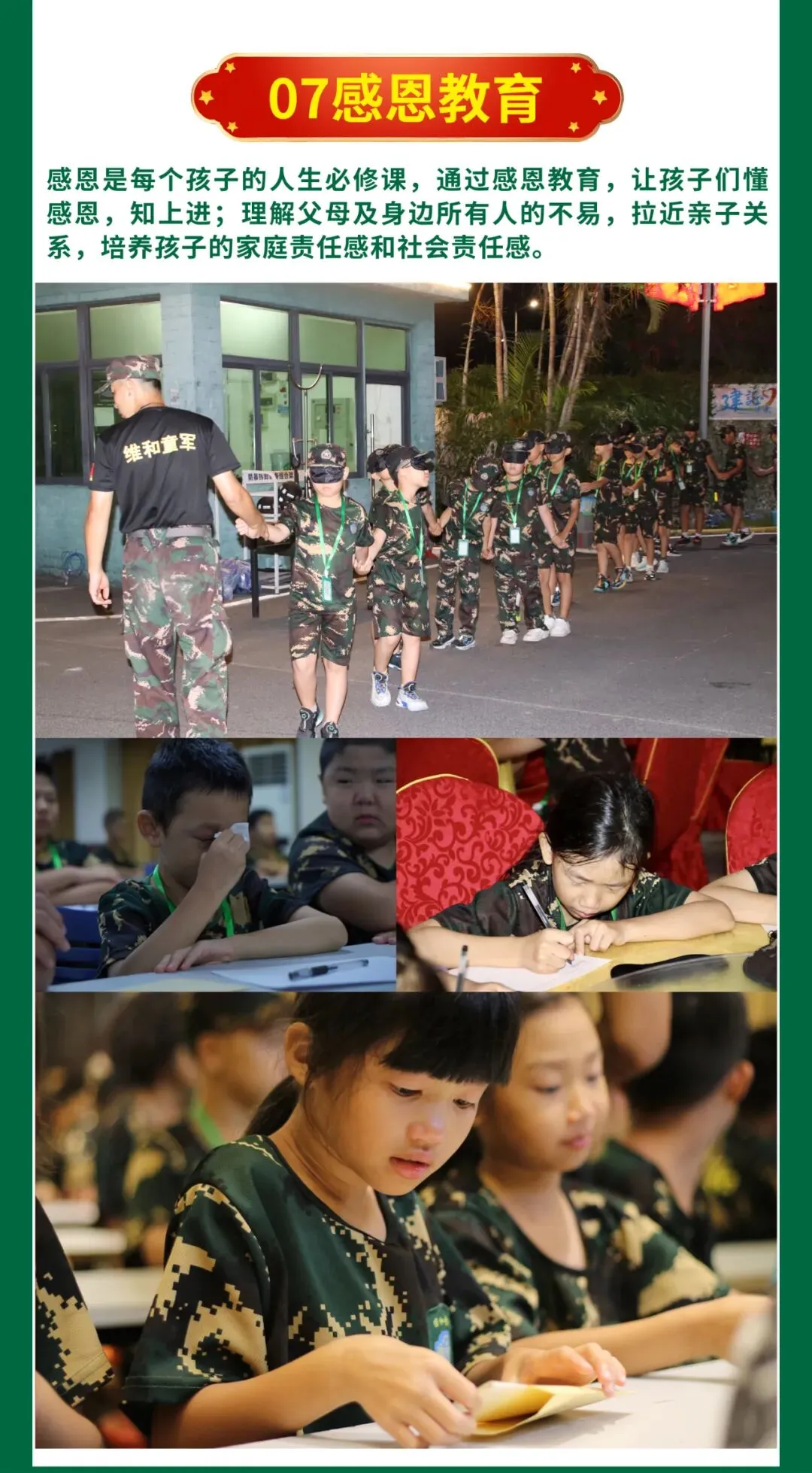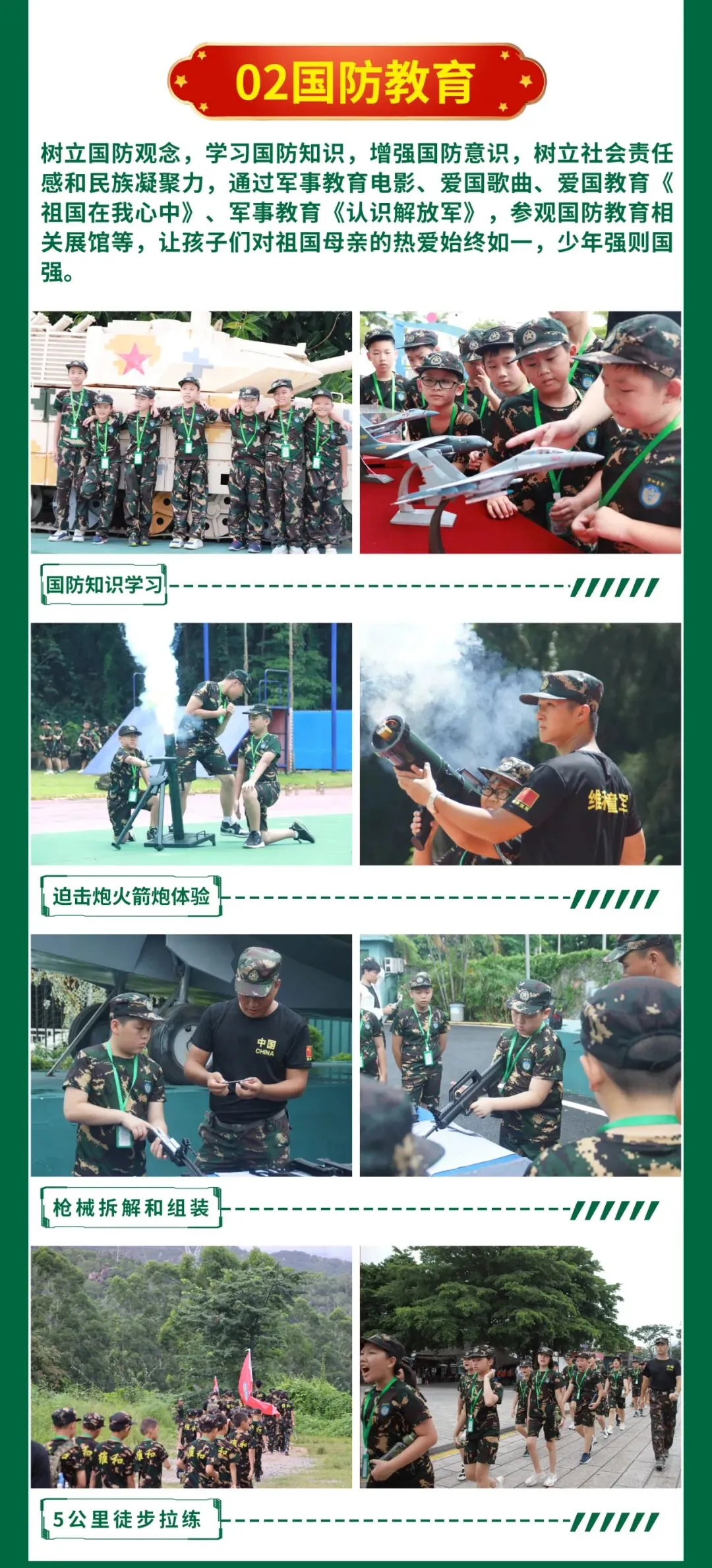 | 军营文化 学唱军歌,军歌是部队必不可少的精神文化,孩子们拉歌比赛、 营员互动、 军旅日记 | | |
