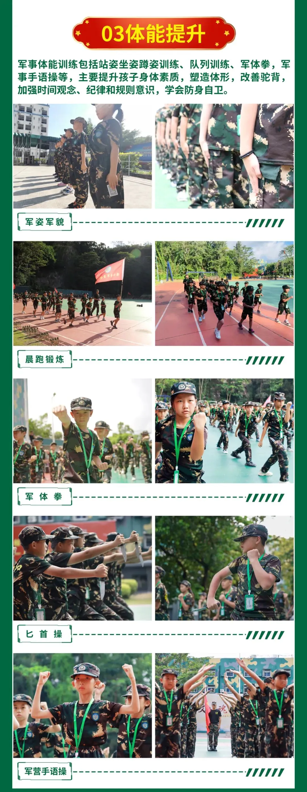 | 军事科目训练 军体拳(8-12)招式强化练习,学习军体拳(13-16)招式,格斗术练(塑造行为习惯、 健强体魄 ) | | |