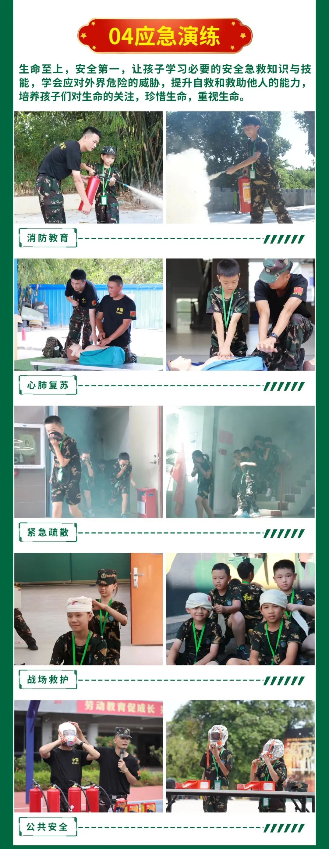 | 消防演练 消防演练课程、 火灾逃生演练、 灭火器使用、 与消防部队官兵互动 | | |