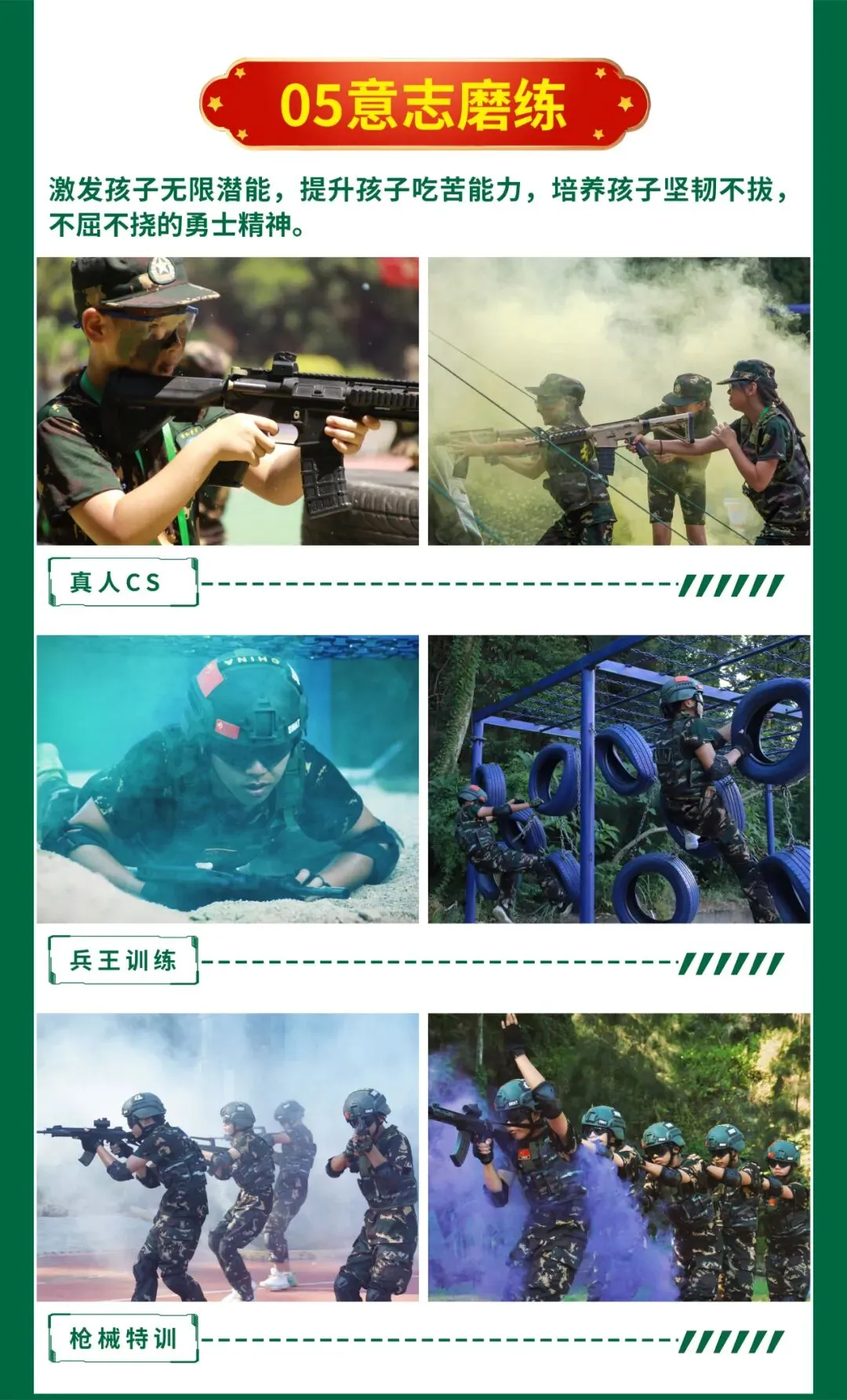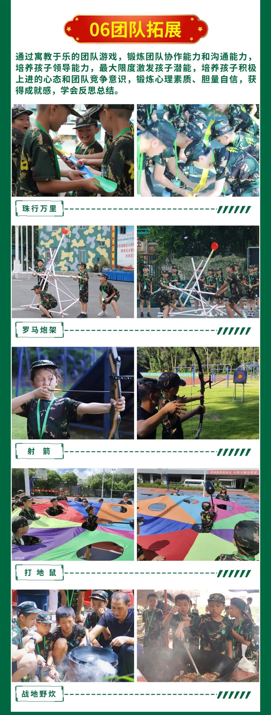 | 挑战项目 军事障碍闯关 ,军事训练, 动手制作罗马炮机对抗战 | | |