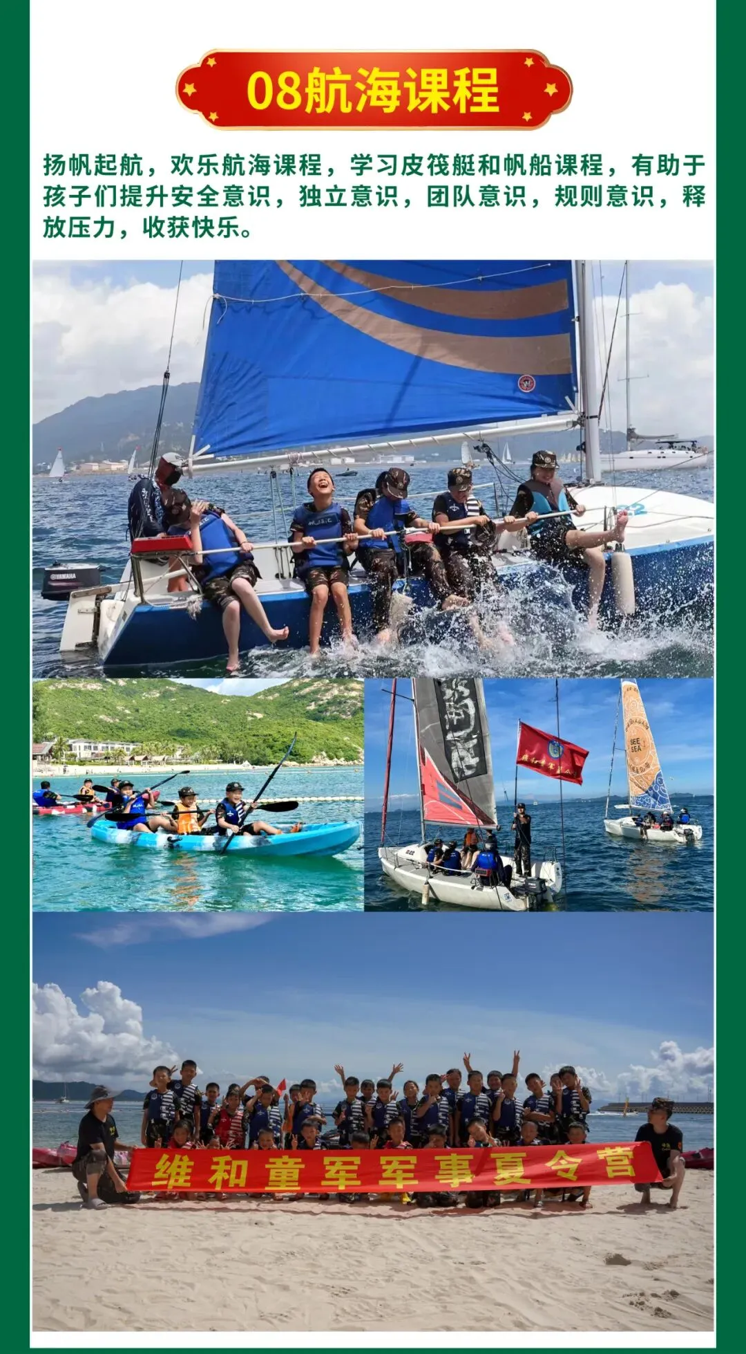 | 航海课程 航海课程, 体验皮筏挺, 帆船出海, 特种兵之“红海行动”对抗赛 | | |