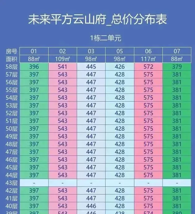 03户型:98平(东南向)单价39600-41100,总价389-404万。