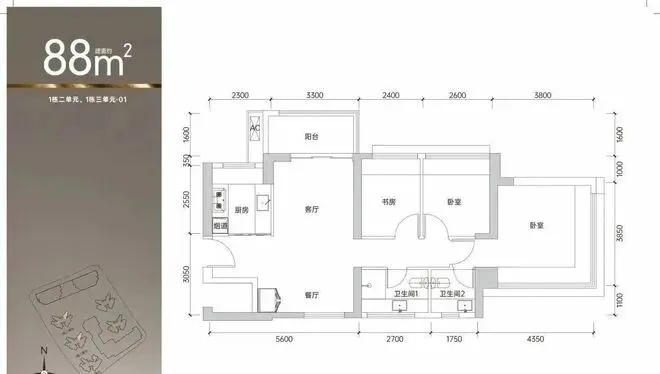 01户型:88平(南北通透)单价39900-40800,总价351-359万。