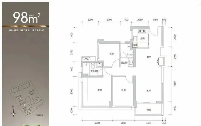 建面约98㎡3房2卫,适合追求尺度的家庭。