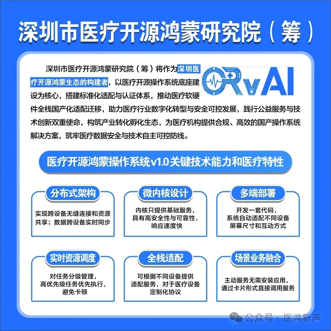 会议期间,深圳市医疗开源鸿蒙研究院(筹)系统展示了其整体构想:聚焦理论引领、底座搭建、体系牵引、生态转化四大环节,明确提出以医疗开源操作系统底座建设为核心,搭建标准化适配与认证体系,推动医疗软硬件全栈国产化适配迁移。