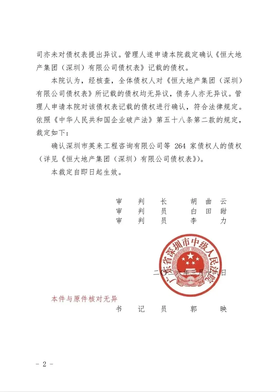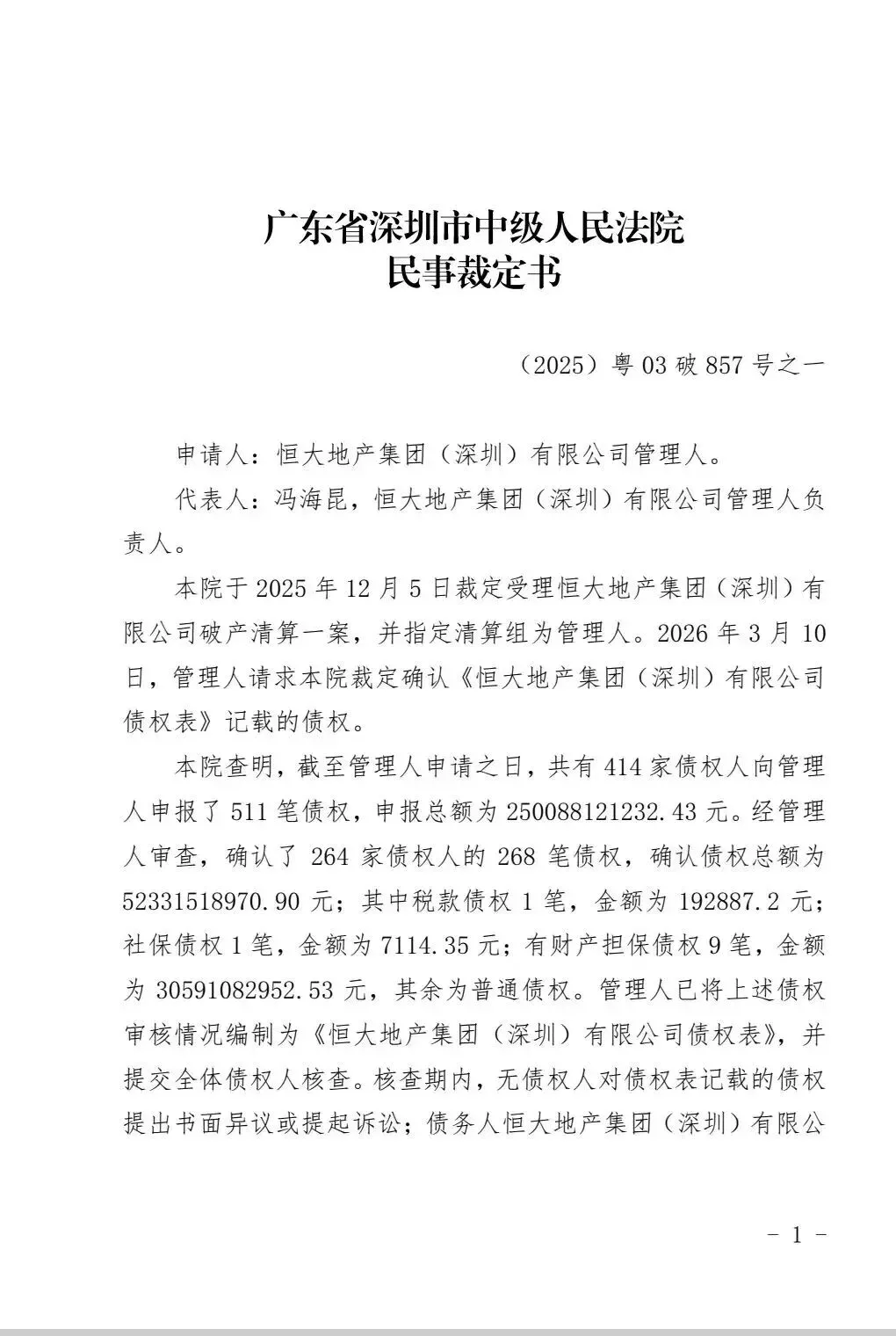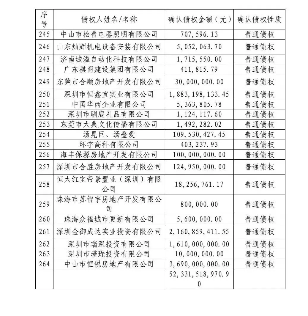根据裁定公告,在近几个月内,恒大的破产管理人共申报511笔债权,申报总额达250,088,121,232.43元。其中,有担保债权为30,591,082,952.53元,此部分债权在扣除税款后享有优先受偿权。实际上,恒大地产集团(深圳)的债权人数量及未申报债权金额远不止于此。由于恒大的债权人已历经五年困境,许多企业已陷入经营困境甚至破产清算。在整个恒大的债权人中,破产案例众多,如南通的几家典型建筑集团均已走向破产。