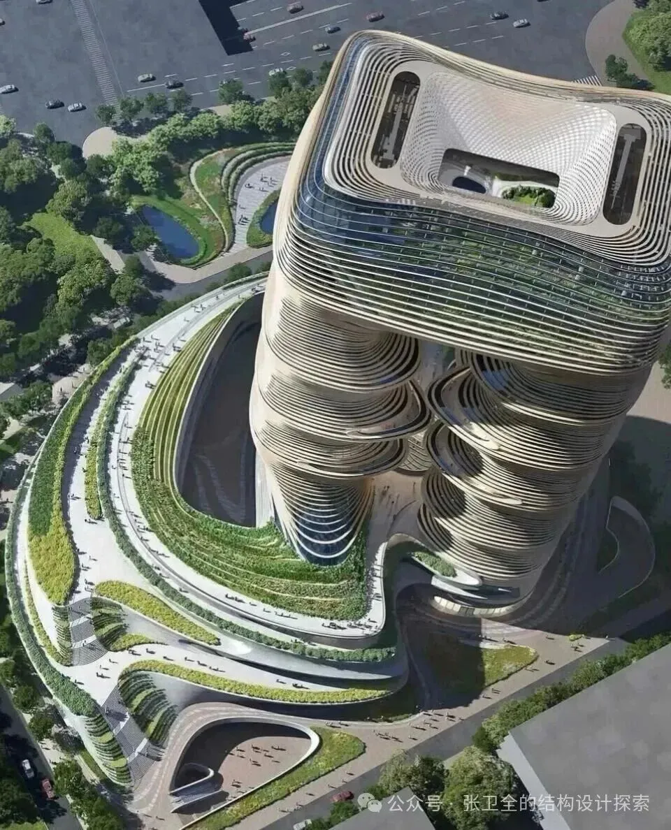 设计灵感源自峡谷地貌,采用流线型结构与层叠百叶幕墙,融合自然采光与遮阳功能,并目标达到中国绿色建筑三星及LEED金级认证。