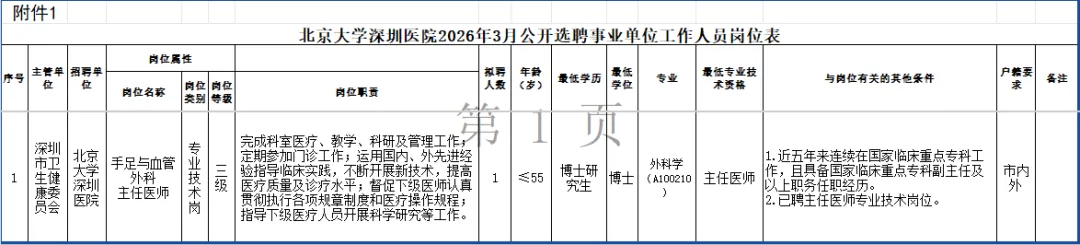 为加强我院人才队伍建设,助力高水平医院学科发展,经医院研究,决定面向社会公开选聘事业单位工作人员1名,具体岗位详见《北京大学深圳医院2026年3月公开选聘工作人员岗位表》(附件1,以下简称《岗位表》)。现就有关事项公告如下: