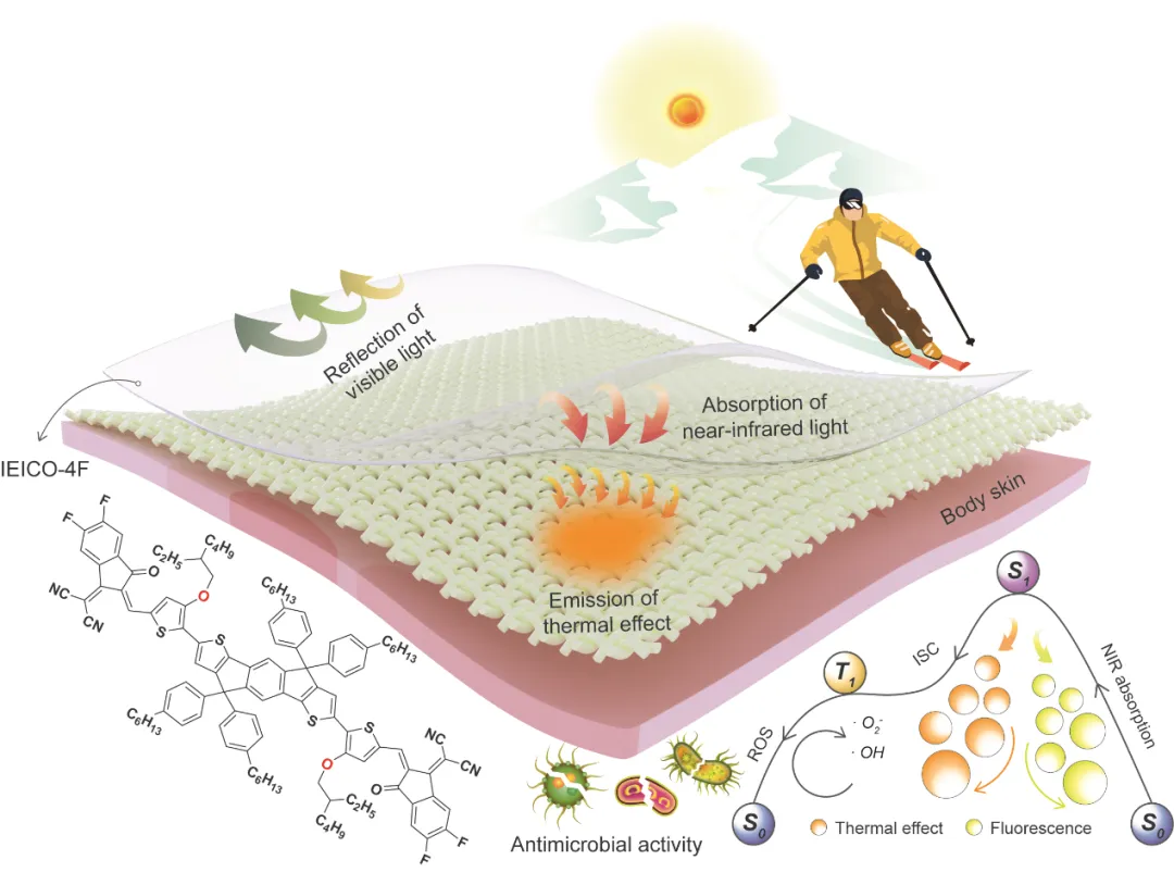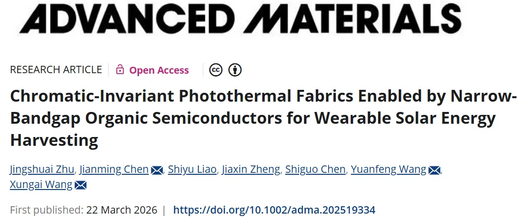 2026年3月22日,深圳大学、香港理工大学及浙江理工大学的研究团队在《Advanced Materials》上发表了题为“Chromatic-Invariant Photothermal Fabrics Enabled by Narrow-Bandgap Organic Semiconductors for Wearable Solar Energy Harvesting”的研究论文。该研究创新性地将窄带隙有机半导体染料集成到织物上,利用其独特的近红外吸收与可见光反射特性,成功研发出一种“无色扰”的光功能创新型织物。
