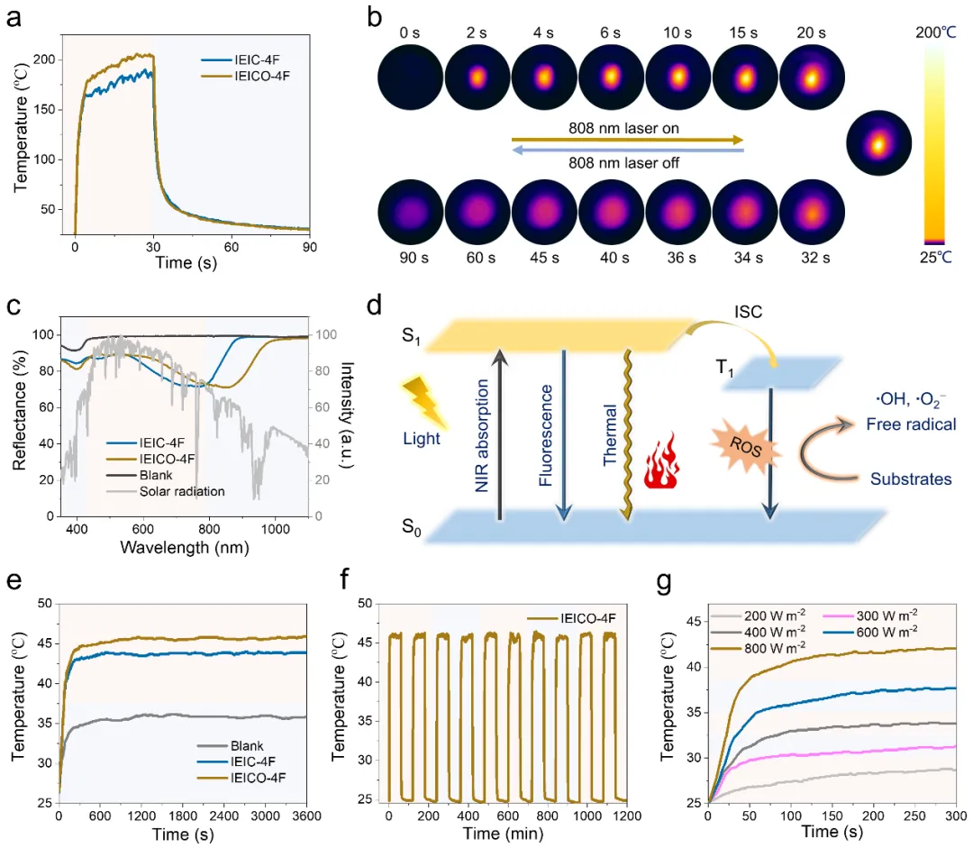 图2 a, IEIC-4F和IEICO-4F粉末在808 nm激光照射下的光热转换行为;b, 通过热像仪拍摄IEICO-4F粉末在808 nm激光照射下的红外热像图,激光在30秒时关闭;c, IEIC-4F和IEICO-4F织物的反射光谱及太阳光谱图。d, 光热材料的工作原理图。e, 通过热电偶测量空白组、IEIC-4F和IEICO-4F织物(4×4 cm)在一个太阳光照下的光热温度。f, 通过热电偶测量IEICO-4F织物在一个太阳光照下的光热循环曲线。g, 通过热电偶测量不同光照强度下照射时间与织物温度的关系曲线。