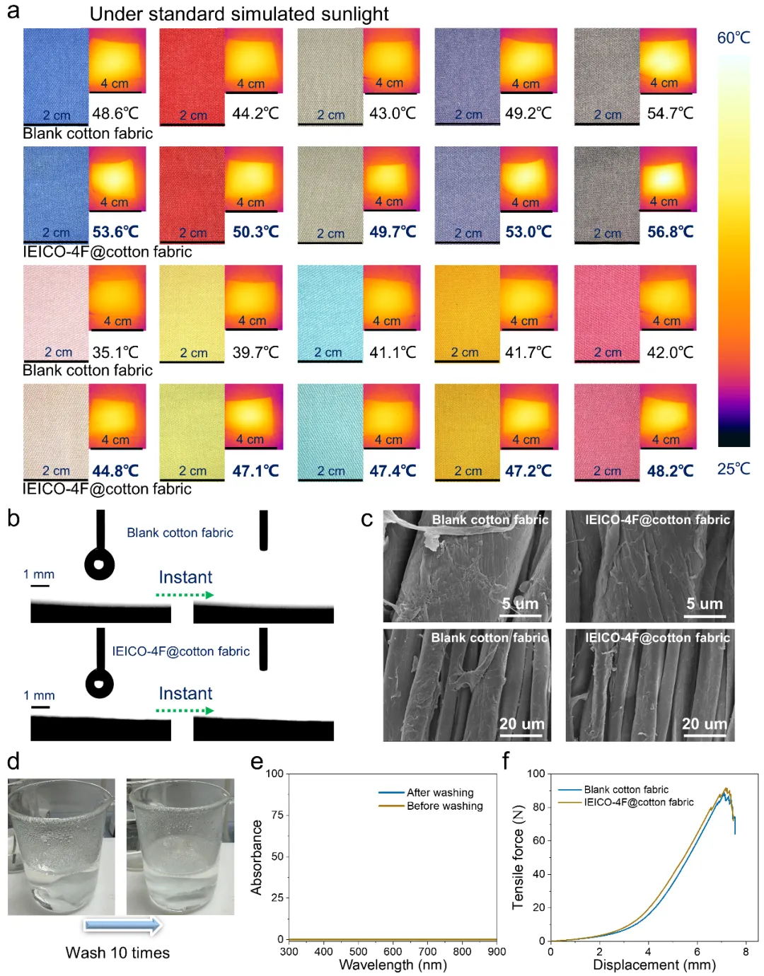 图3 a,不同颜色织物在标准太阳光照射下的情况,图像由热像仪拍摄,温度值由热电偶记录;b,棉织物上的水接触角图像;c,空白棉织物和IEICO-4F@棉织物在20000倍和5000倍放大倍数下的扫描电镜图像;d, IEICO-4F@棉织物在洗涤剂中搅拌的照片。e,搅拌前后洗涤剂的吸收光谱。f,空白棉织物与IEICO-4F@棉织物的拉伸曲线。