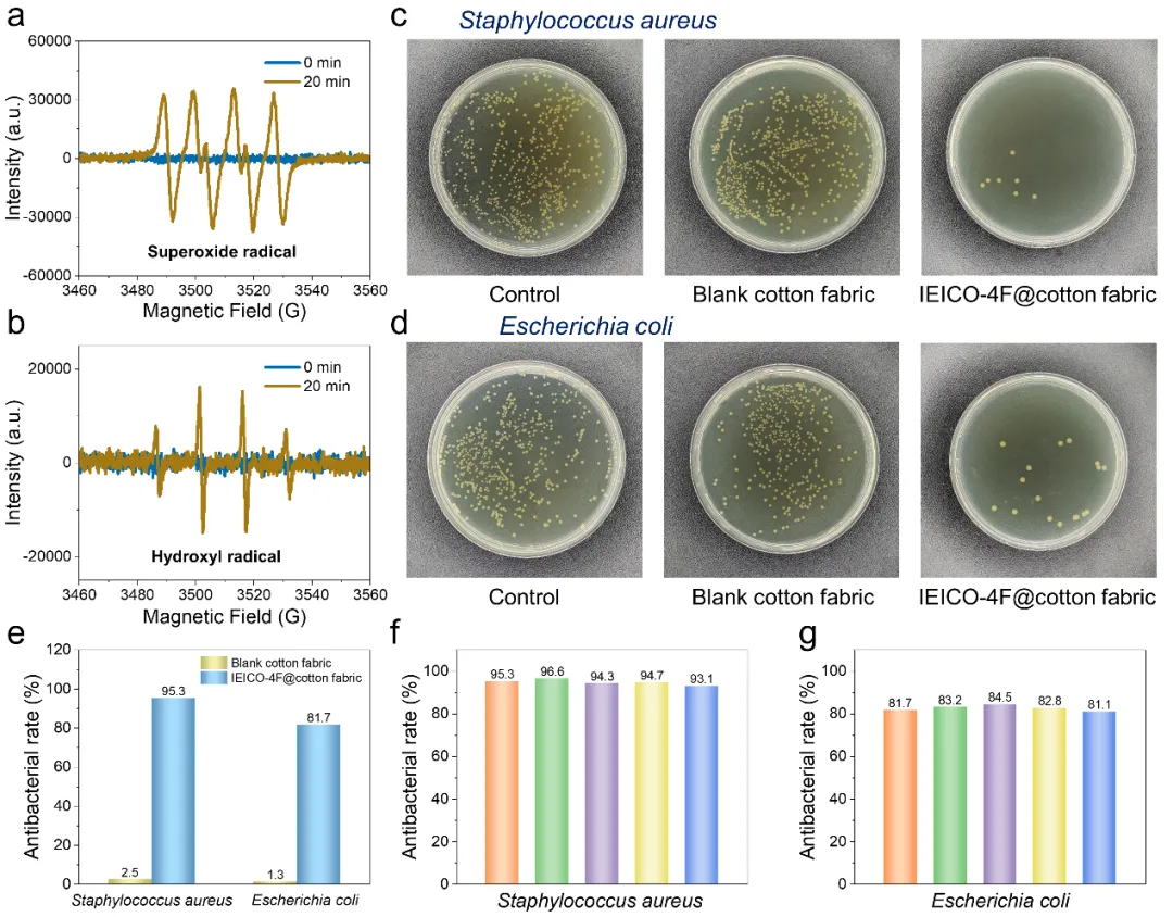 图4 a, IEICO-4F@棉织物在黑暗条件下和光照20分钟后,超氧自由基的电子顺磁共振波谱;b,羟基自由基的电子顺磁共振波谱;c,金黄色葡萄球菌和d,大肠杆菌悬液通过涂布法在平板上于37°C培养后的菌落形成单位代表性图像;e,金黄色葡萄球菌和大肠杆菌的抗菌率;f,同一IEICO-4F@棉织物对金黄色葡萄球菌和g,大肠杆菌的循环抗菌性能。