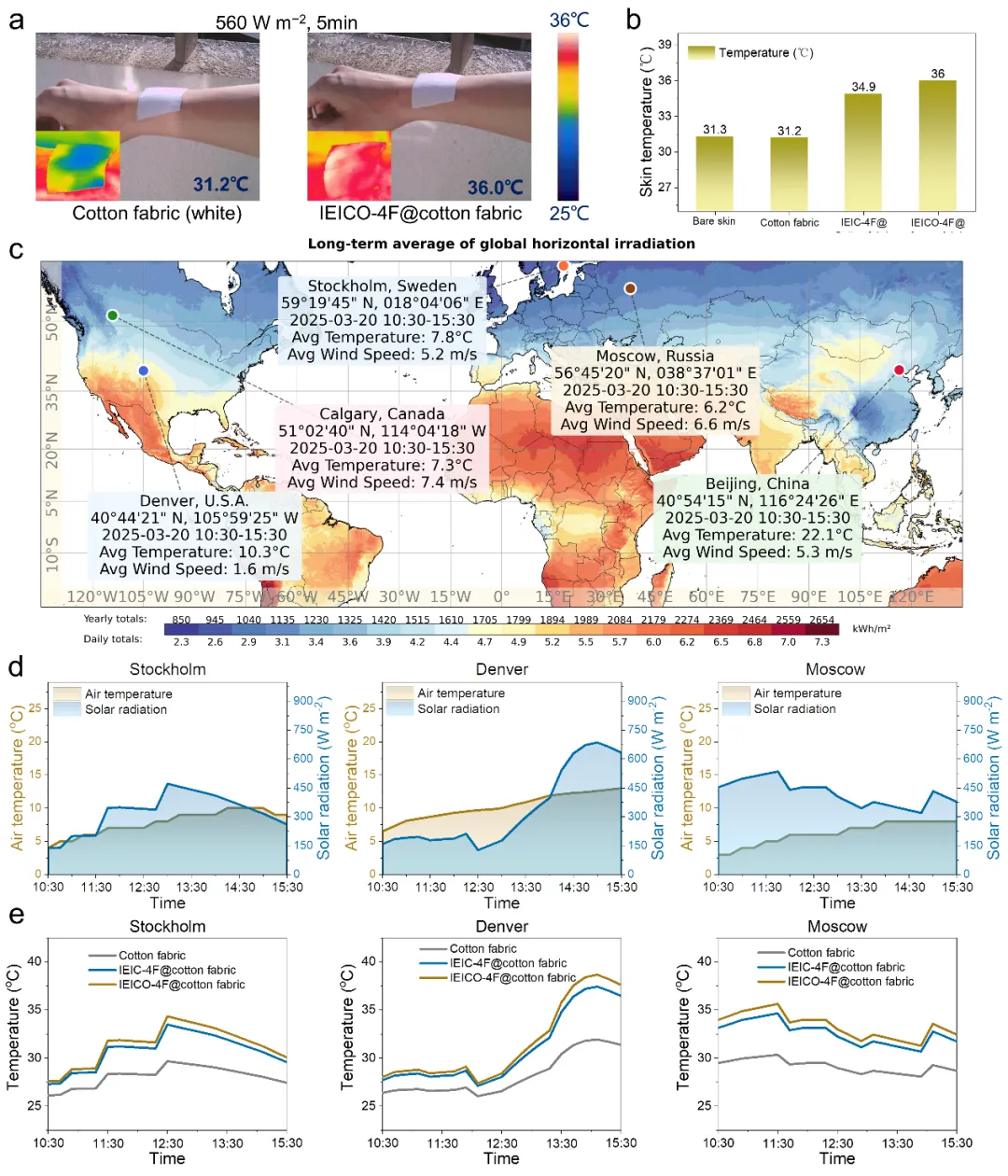 图5 a,在实际太阳辐射下的热成像图(天气晴,东风2级,湿度53%,气温25℃,香港),图像由热像仪拍摄,温度值由热电偶记录;b, IEICO-4F@棉织物在人体皮肤表面照射五分钟后的温度值。c,全球太阳能资源分布图。根据CC-BY知识共享署名4.0国际许可协议(https://creativecommons.org/licenses/by/4.0)改编。标注点代表五个测试地点:斯德哥尔摩(瑞典)、丹佛(美国)、莫斯科(俄罗斯)、北京(中国)、卡尔加里(加拿大),插图展示了这五个测试地点的地形信息和气象信息。d,斯德哥尔摩、丹佛和莫斯科的详细太阳辐照度与环境温度数据。e,在斯德哥尔摩、丹佛和莫斯科的日光照射下,覆盖空白棉织物、IEIC-4F@棉织物和IEICO-4F@棉织物的模拟皮肤在5小时内的温度变化。