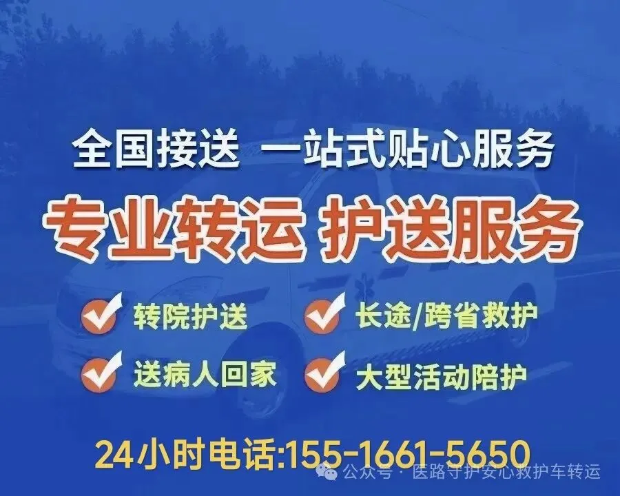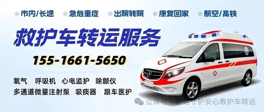 🌟 选择我们的三大理由,让转运更安心- 🚑 硬核配置·医疗级护航全系监护型救护车配备:✅ 心电监护仪/氧气瓶/担架床/呼吸机/除颤器等应有尽有✅ 负压消毒系统·隔绝交叉感染✅ 持证医护团队全程随行,实时监测生命体征- ⏰ 极速响应·24小时待命一键预约,10分钟快速出车跨市/跨省转运无压力,GPS精准导航规划路线拒绝等待焦虑,你的需求就是第一优先级- ❤️ 定制服务·细节里的温暖- 个性化车型选择(普通型/重症监护型)- 全程轻声沟通,缓解紧张情绪- 协助搬运行李、对接医院,省心更贴心👥 哪些场景需要我们?✅ 长途转院/返乡的重症患者✅ 行动不便者的定期就医/透析✅ 大型活动医疗保障应急备用✅ 跨境转运/旅游突发健康状况💡 服务范围划重点!✔️ 覆盖全市及周边省市✔️ 提供正规票据·费用透明无隐性消费📞 即刻预约,守护不延迟☎️ 电话:155-1661-5650每一次出发,都是对生命的郑重承诺,我们团队的每一位成员都将竭尽全力为您提供满意的转运服务,安全护送每一段旅程。