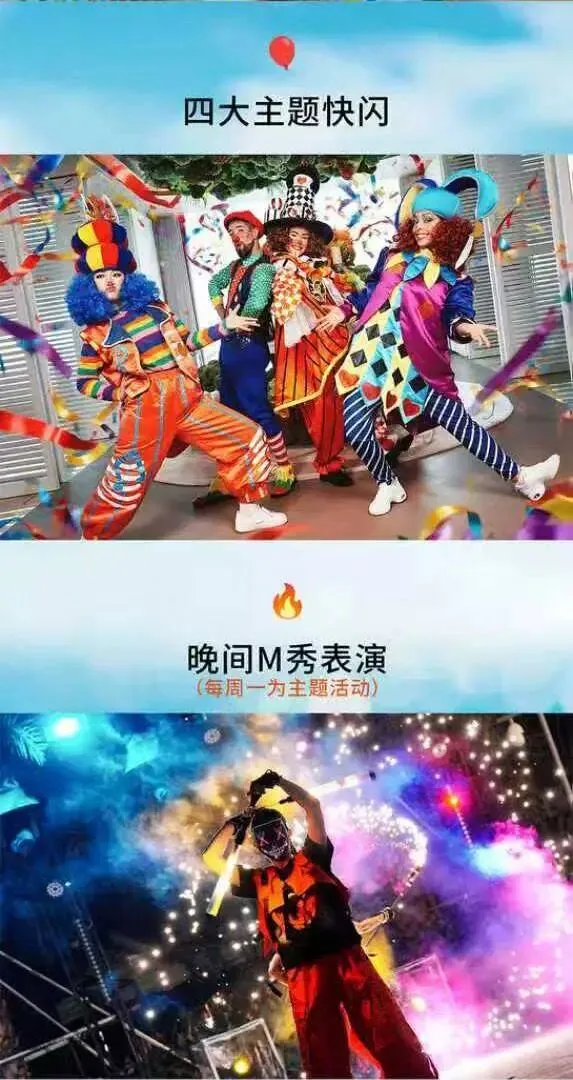 【享】晚间M秀或晚间主题派对(每周二至周日,每周一运动或尊巴之夜,外籍演员休息;法定节假日正常;演出地点:户外泳池区域(如因下雨则取消或变更场地,以实际为准)