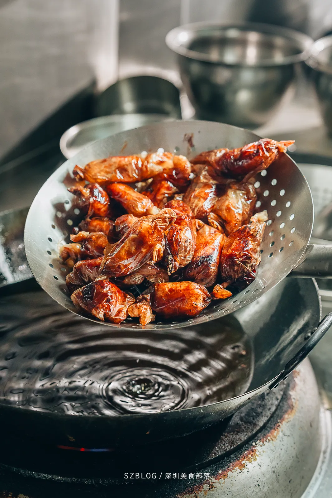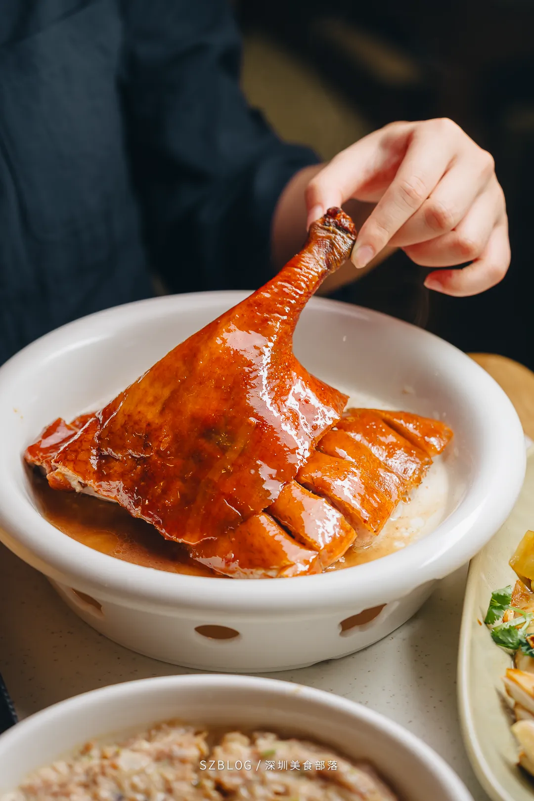 鸿发饭店的烧腊档口,烧鹅总是最先被点完的那一个。皮烤得油亮,斩件时能听到脆皮裂开的声音。入口皮脆肉嫩,脂香足,咬下去会爆汁。