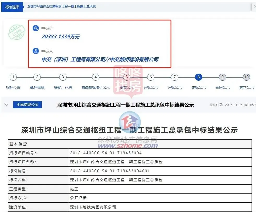 1月26日,深圳坪山综合交通枢纽工程一期工程施工总承包中标结果公示。