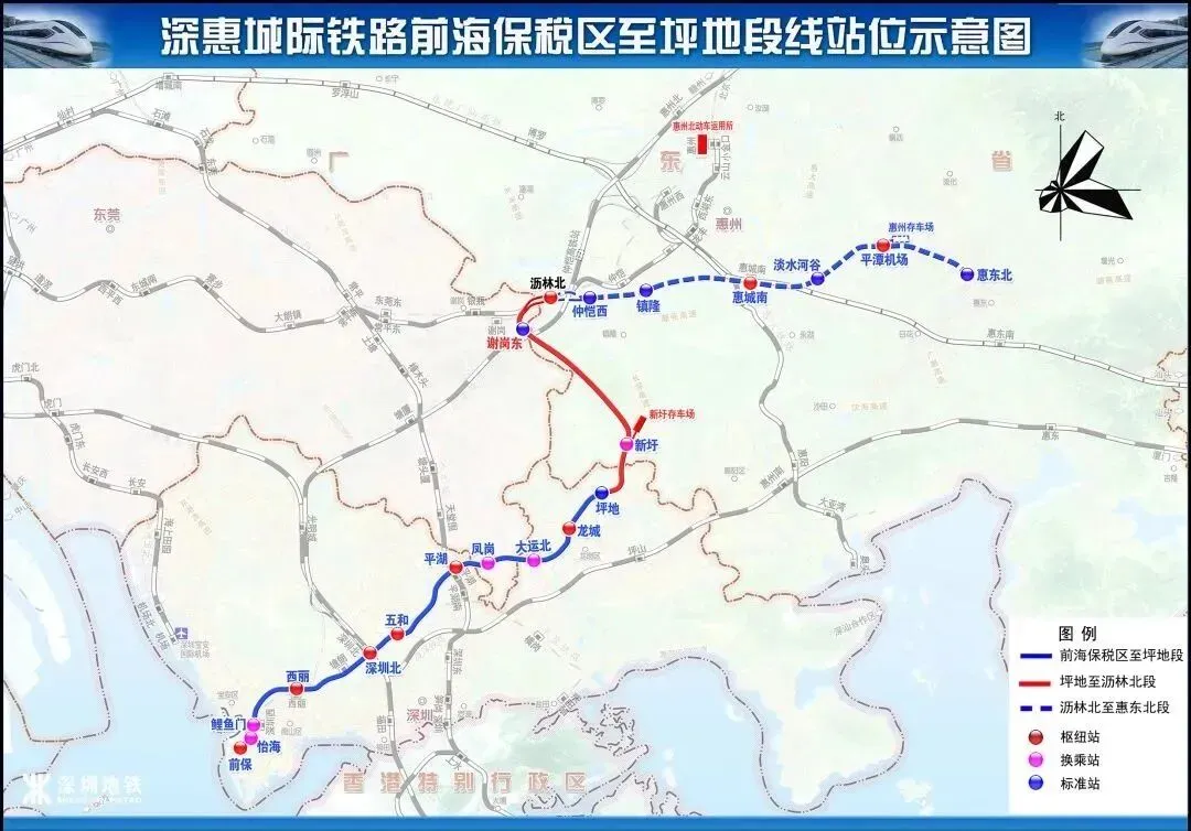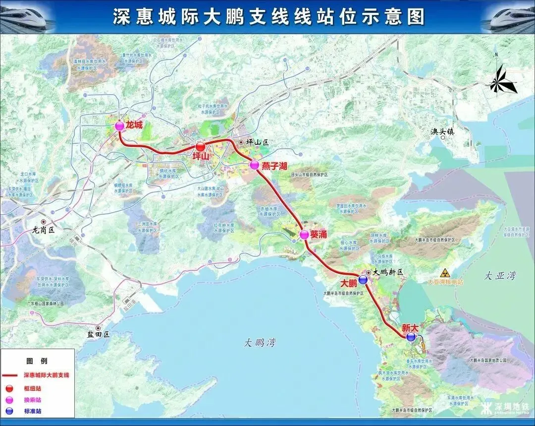 深惠城际大鹏支线:起自龙岗龙城站,途经坪山,止于大鹏新区新大站,全长约39.4公里,设计时速160公里,强化东部与大鹏新区的联系。