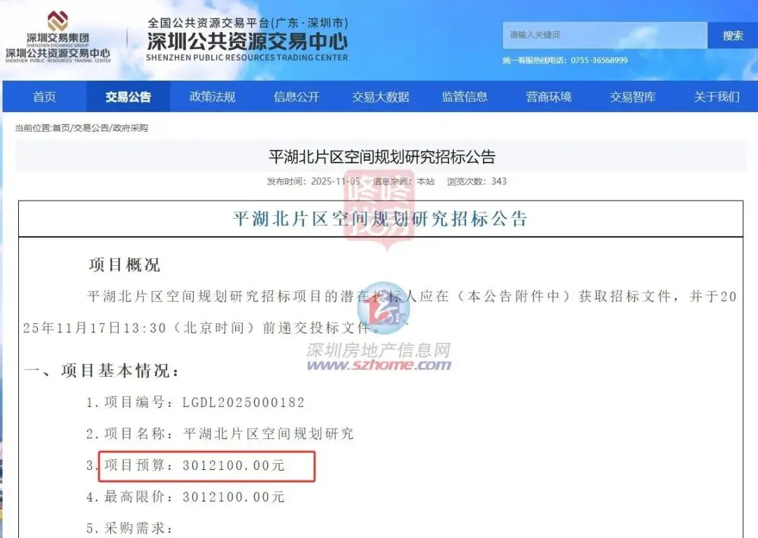 近日,深圳市规划和自然资源局龙岗管理局正式启动“平湖北片区空间规划研究”项目招标,计划投入金额301.21万元。