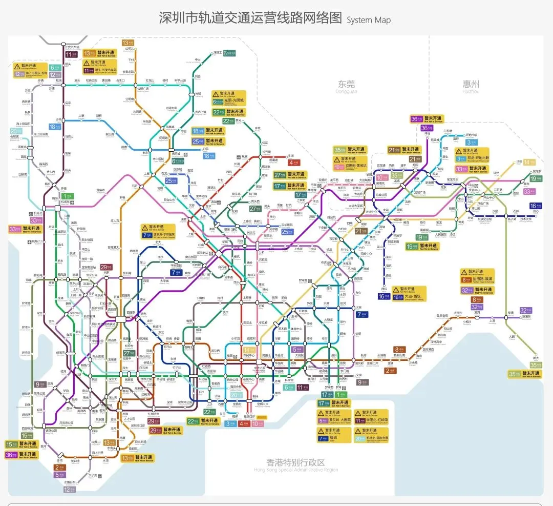 地铁16号线:已开通运营,连接龙岗与坪山,设站24座,强化东部区域内部联系。