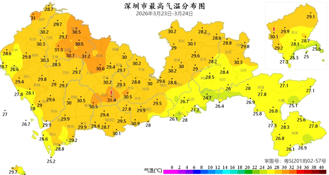 3月24日,深圳地面气象站测得最高气温31.4℃。