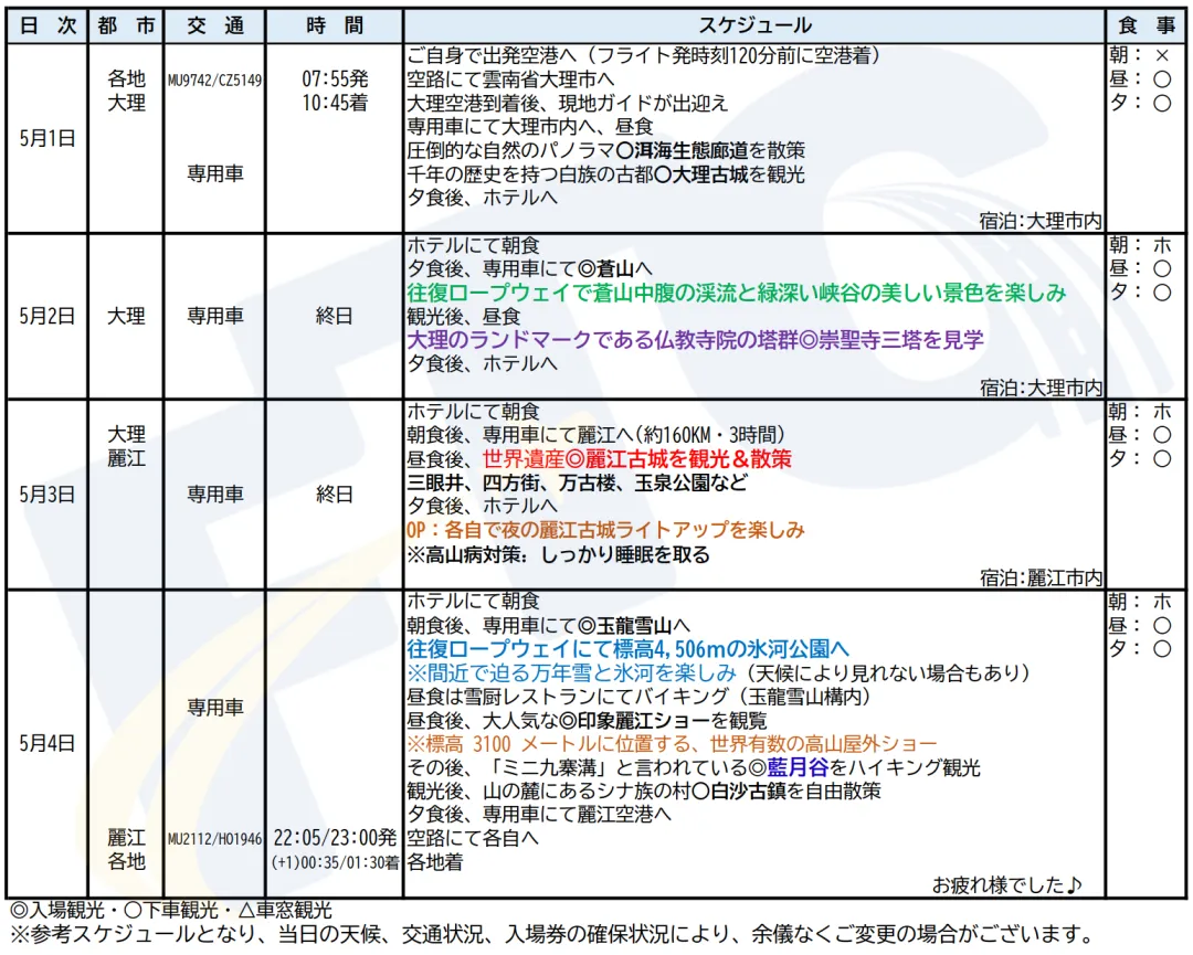 ※フライトを利用するツアーでは、運航ダイヤ改正に伴い行程内に明記された時刻・運航便が変更になる場合があります。その場合には、ご予約時に変更内容をご案内いたしますので、予めご了承ください。悪天候等でご利用便の欠航・運休の可能性が高いことが予想されても、航空会社が正式に欠航・運休を決定していない場合、原則ツアーは通常催行となります。欠航・運休が決定する前のお客様判断による取消は、規定の取消料を申し受けます。