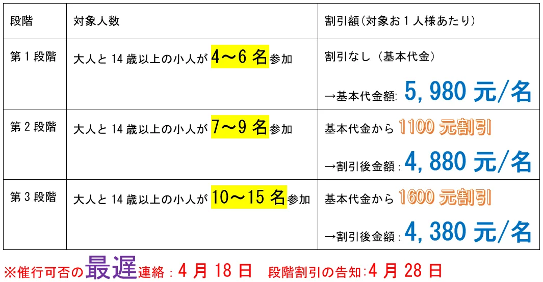 段階割引とは、対象となる大人と14歳以上の小人の参加人数によって、段階的に割引が適用されるシステムです。