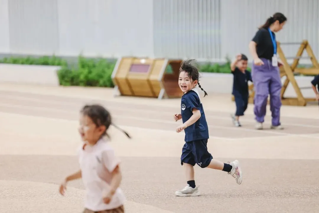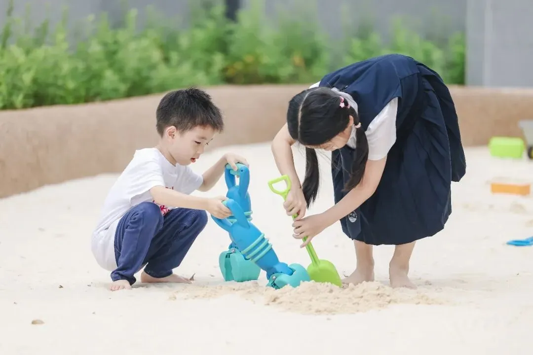 Kayla就一本正经地提议:“我希望图书馆里有动物。”学校真的采纳了,其中一个设计方案是把门设计成长颈鹿的脖子,椅子做成熊的模样。还有个小男孩,是个“我的世界(Minecraft)”迷,他说想要有游戏元素,要有机器狗。老师也没有敷衍他,认真地记下来,说会考虑把这些元素放进去。这种被尊重的体验,对孩子来说太珍贵了。现在一到周末放假,Kayla反而会觉得无聊,问我:“妈妈,能不能天天都去幼儿园?”Kayla不是那种运动细胞很发达的孩子。为了让她强身健体,我在校外给她报了滑板课。但最近我发现,她非常抗拒去上那个滑板课,一到时间就磨磨蹭蹭。我就去跟她的外教老师“抱怨”这件事。外教听完,很认真地跟我分析:“Kayla妈妈,Kayla不想去可能不是因为懒,而是因为她已经很累了。在明湾,我们每天有大量的户外活动时间,攀爬、跑跳、挖沙、障碍赛……对于现阶段不是那么热爱运动的她来说,运动量其实已经饱和了。”的确,她每天放学回来,鞋子里都能倒出来好多沙子。那一刻我既心疼又欣慰——心疼的是误会了孩子,欣慰的是,这里的老师比我观察得更细致,而且他们是真的在关注孩子的身心状态,用心在教学。如果用一个词来形容明湾,我会用“可能性”。这所新学校,给了我女儿无限成长的可能性。△明湾幼儿园给孩子无限可能