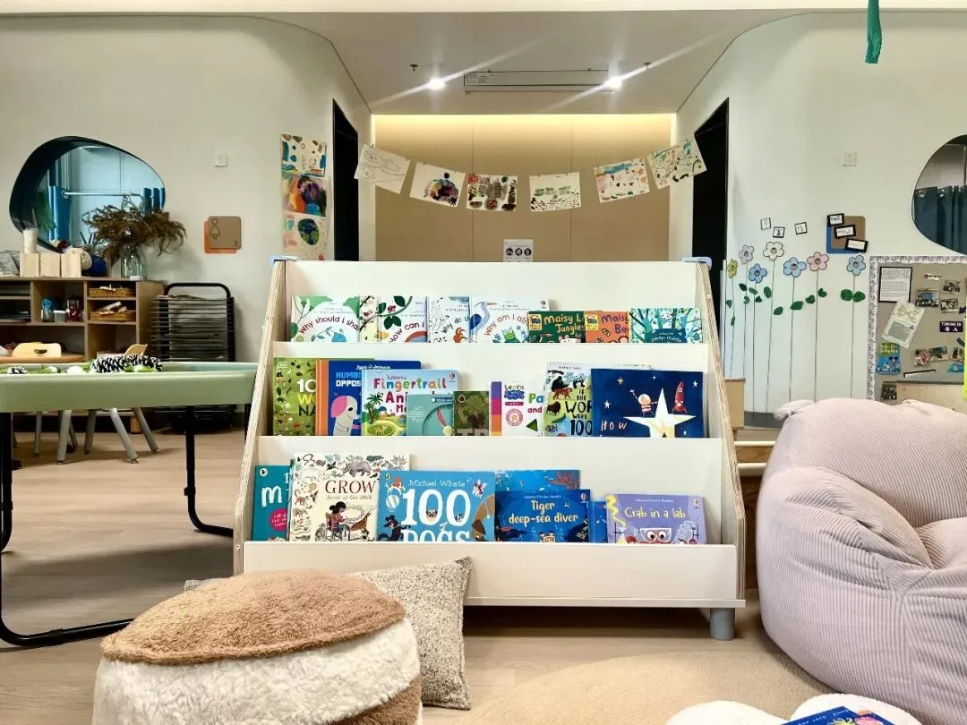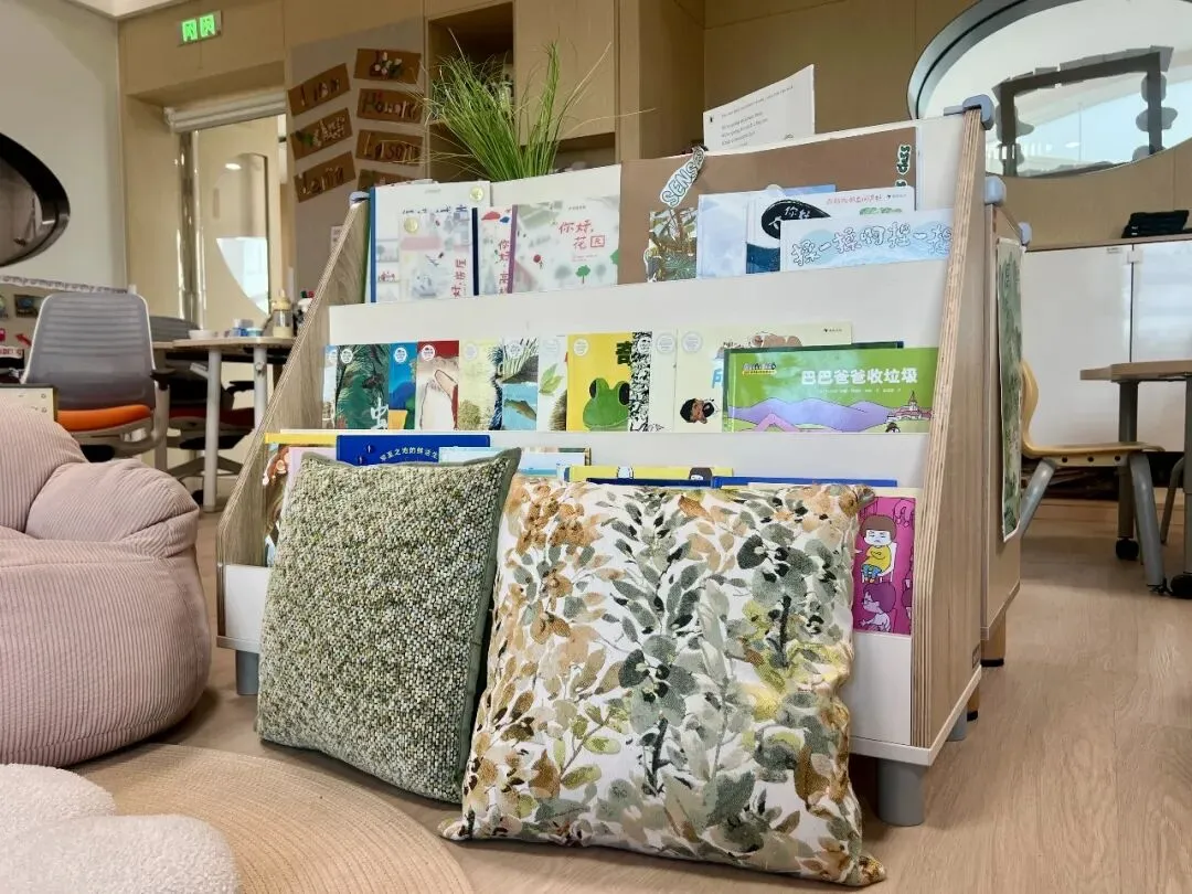 天知道,我什么都没报。我也在观察,明湾到底施了什么魔法?后来我发现,这里的英语教学根本不是我小时候那种“背单词、读课文”。它们把语言融合在了生活里。比如一些特色节日,不是为了过节而过节,而是把相关的词汇、文化融入到那一周的场景里;每天排队、洗手、吃饭,老师发出的全是英文指令。孩子不需要刻意“学”,她是在“用”这门语言生活。除了语言,明湾最让我感动的是它真的在“听”孩子说话。最近幼儿园在搞“图书馆共建”活动。别的学校图书馆长什么样都是大人说了算,装修好了通知孩子进去坐。但在明湾,阅读是孩子的头等大事,当然要听“甲方”的意见。△舒适的阅读空间,既有软包沙发,也有小板凳,满足不同习惯孩子的喜好
