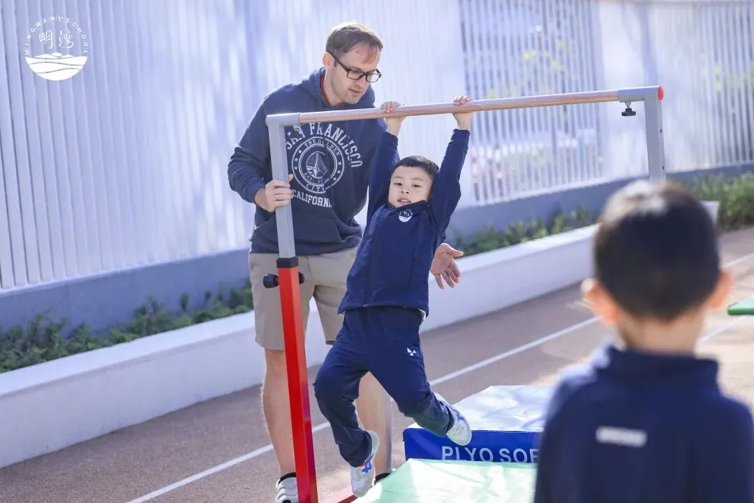 女儿以前是体育“困难户”,加上之前学校的体育老师比较看重成绩,有点“拉高踩低”,搞得她评三好学生总是卡在体育这一关。但在明湾,体育课不只是跑圈、测标。老师带她们玩跑酷、练体操,先让孩子觉得“好玩”,再循序渐进地加量。前两天我去接她,发现她不再是躲在场边围观的人,而是积极得参与进去了,这让我非常惊喜。△只要天气允许,美好的一天就从户外运动开始