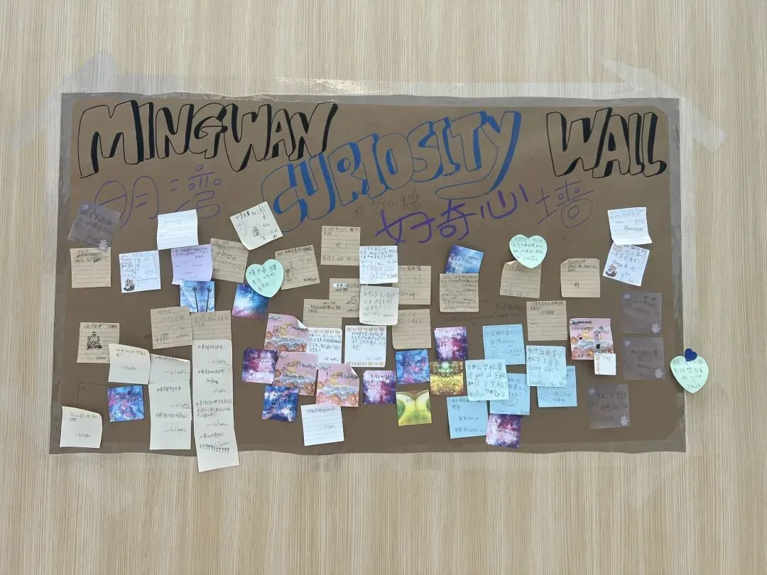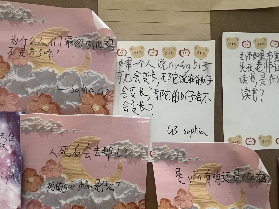 这些问题,有的老师当场解答,有的几句话说不清,老师就会给她开书单,让她自己去书里找答案。这正是我希望她拥有的能力——构建世界观、沟通表达、解决问题。△好奇心墙上,五花八门的问题